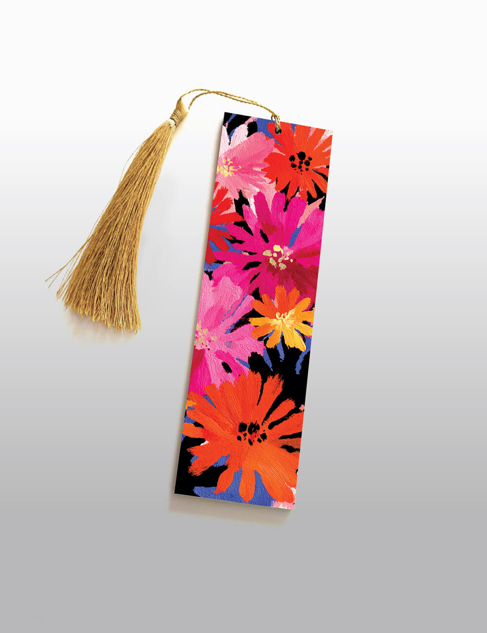 "Joy in Bloom" Wooden Bookmark (2 x 6 inch) is made from eco-conscious 2.7 MM Pine Wood and UV Printed on both sides. The vivid floral art explodes in rich tones of pink, orange, yellow, and red, standing out boldly against a deep black base. This painterly composition captures the carefree spirit of spring in full bloom. Paired with a golden tassel, it brings energy, color, and charm to your pages.