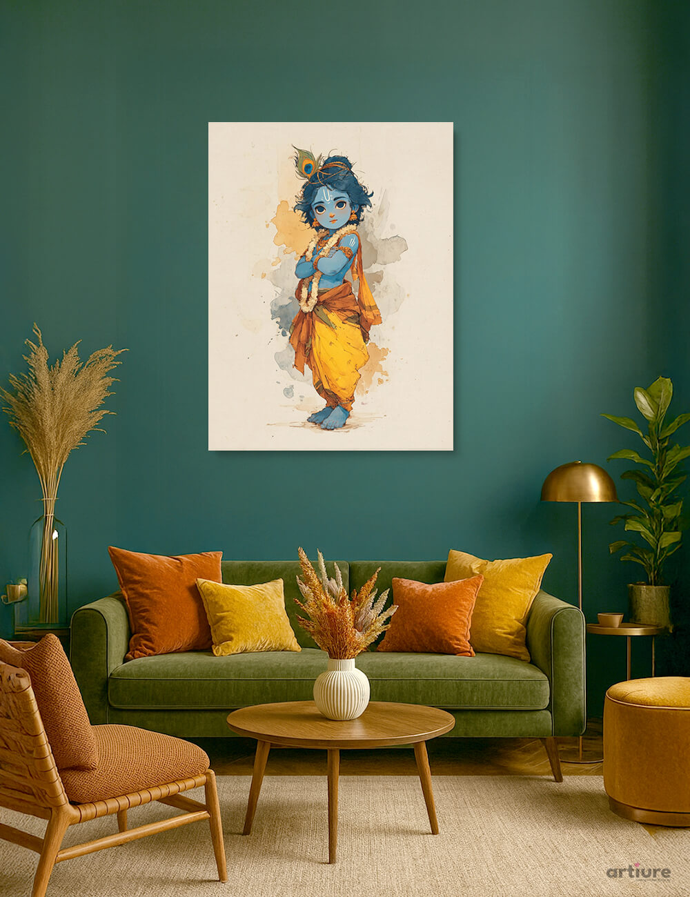 "Krishna’s Confident Charm" Canvas Print captures the charismatic posture of Bal Krishna—arms crossed, chin up, and eyes gleaming with playful pride. With a peacock feather adorning his hair and a garland around his neck, he stands barefoot in a golden yellow dhoti against a soft textured backdrop. The artwork’s simplicity and expressive pose make it a delightful addition to pooja corners, children's spaces, or festive decor.