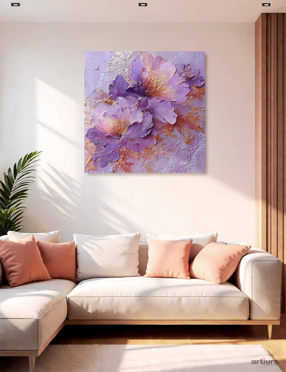 There's something about purple flowers that feels like a secret being whispered — and these blooms are telling stories in the most beautiful way. Thick, sculptural petals emerge from a lavender dreamscape, their surfaces catching gold like morning light through amethyst. The impasto technique makes every flower feel tangible, as if you could reach out and touch velvet. Rich purples flow from deep violet to the softest lilac, while golden highlights dance across each petal like scattered stardust. This is the kind of piece that transforms a space into something more romantic, more alive. Perfect for a bedroom where dreams take shape, or a living room that deserves a touch of poetry on its walls.