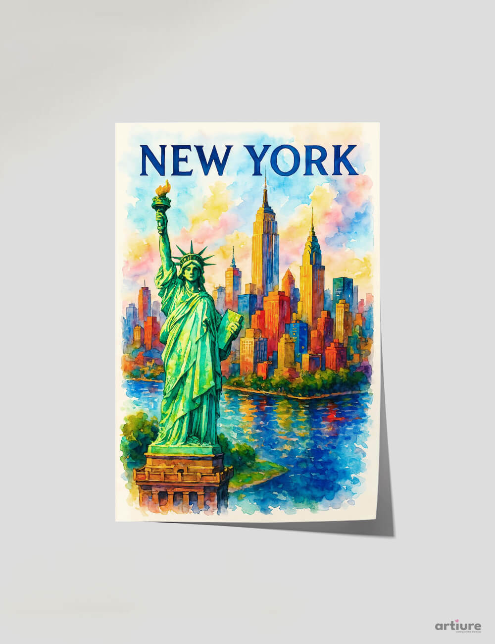 Celebrate the enduring spirit of New York with this dynamic poster featuring Lady Liberty standing proud against the iconic Manhattan skyline. The watercolor vibrancy captures the city's resilience and grandeur, blending rich tones of the skyline with the cool blues of the Hudson. A perfect tribute to the city that never sleeps, this piece brings energy and patriotism to any space.