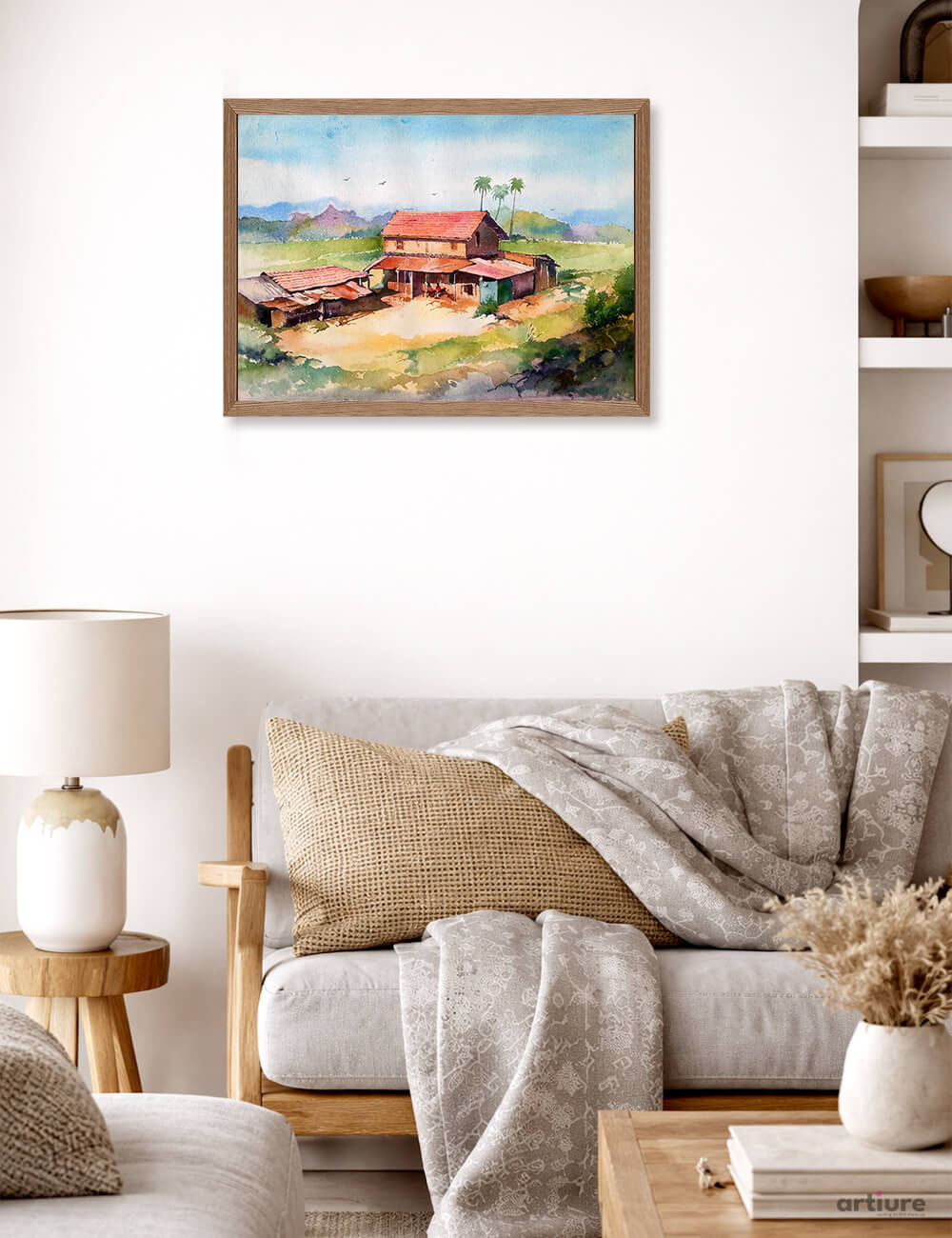“Life Beyond The City” beautifully captures the calm and simplicity of rural living through delicate watercolor strokes. The artwork showcases rustic homes surrounded by lush green fields, open skies, and distant hills, evoking a sense of peace and freedom away from urban chaos. Subtle color transitions and soft textures create a dreamy atmosphere, highlighting the harmony between nature and human life. The composition reflects slow-paced village rhythms, where life flows naturally and quietly. This painting invites viewers to pause, breathe, and reconnect with simplicity, offering a nostalgic escape into a world untouched by the pressures of modern city living.