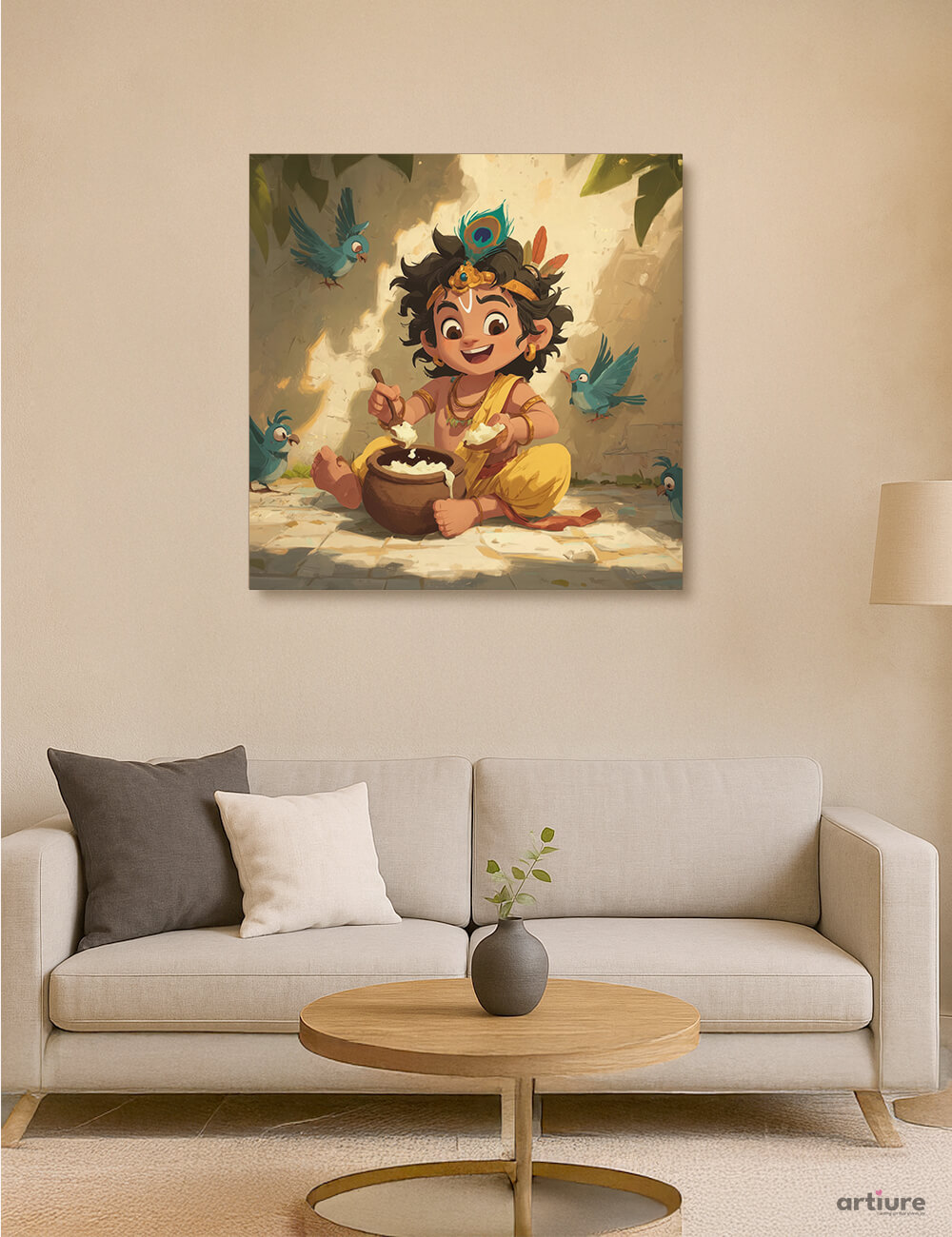 "Little Krishna’s Feast" Canvas Print is a delightful illustration of young Krishna relishing butter under the shade of a tree. With tousled curls, a bright smile, and peacock feather crown, he’s surrounded by chirping bluebirds in a sun-dappled courtyard. The cartoonish charm and warm earthy palette make this artwork perfect for children's spaces, festive gifting, or simply adding joy and devotion to any room.