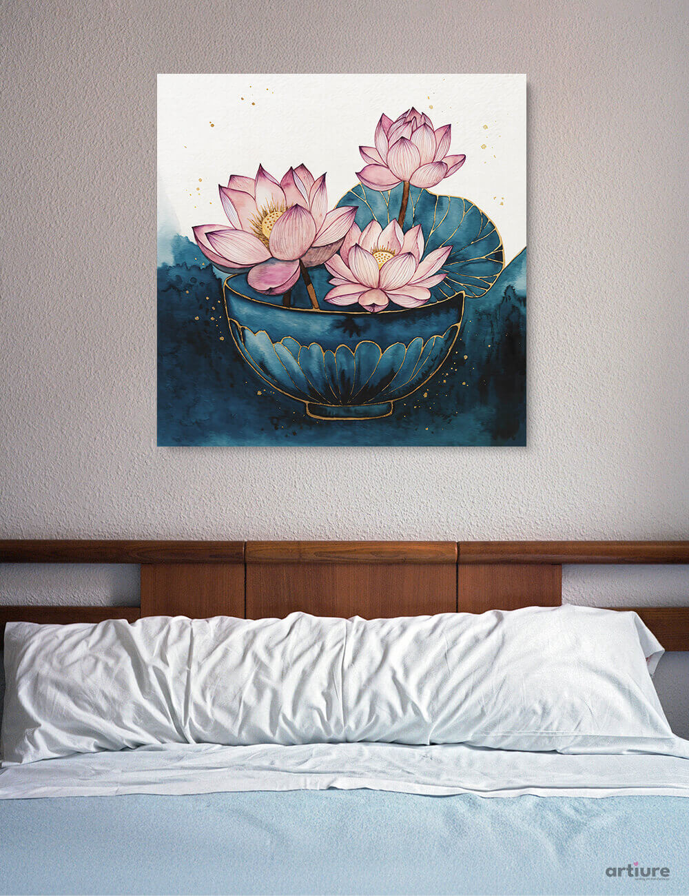 Lotus in Indigo Bowl presents a serene composition of pastel-hued lotus flowers emerging from a richly patterned, navy-blue vessel. Subtle gold outlines trace the petals and bowl edges, adding a touch of luxury to the soft watercolor washes. Perfect for living rooms, boho-themed corners, or meditation spaces seeking a calm, artistic focal point.