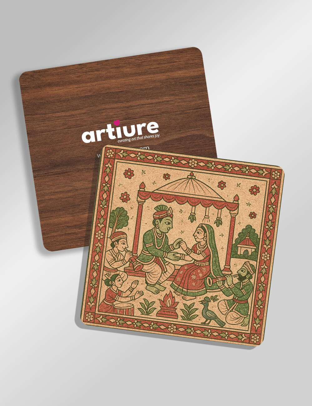 This coaster pair showcases a vivid Madhubani-inspired scene set within a bordered frame. The central couple under a canopy, surrounded by stylized flora and dotted figures, captures festive wedding rituals rendered in earthy reds, greens, and ochre against a warm beige ground. The design embraces traditional folk-art motifs with bold outlines and balanced symmetry, evoking artisanal craft and cultural storytelling. Printed on a cork composite, the image preserves textured grain and rustic charm, making it a durable yet decorative accessory for dining tables, coffee corners, or bar carts. Ideal for gifting, it complements both contemporary kitchens and culturally enriched interiors, inviting hands to pause and savor a moment of timeless artistry.