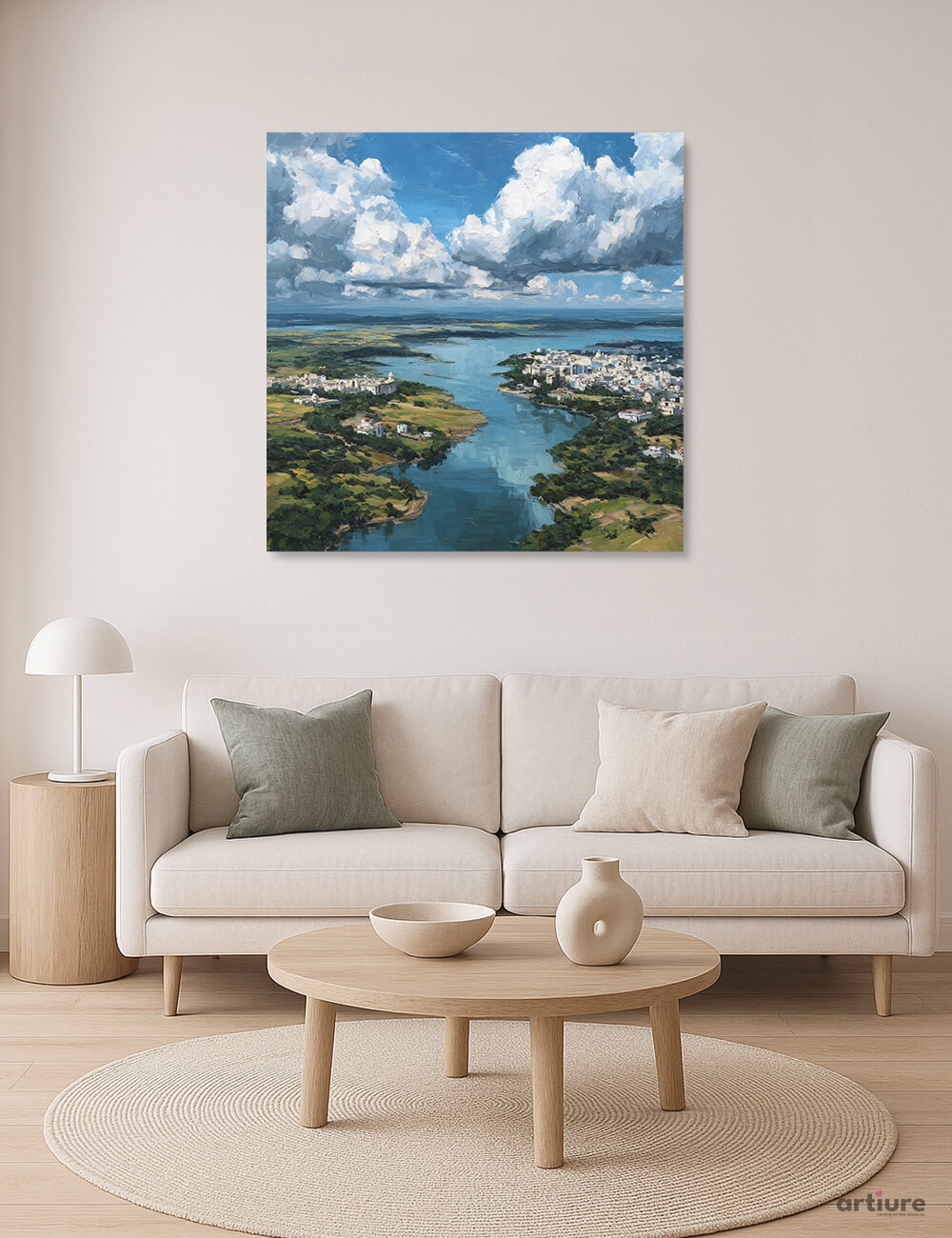 This canvas print captures a luminous riverscape where a serpentine river threads between lush riverbanks and distant coastal towns. Broad, painterly strokes render a sky heavy with clouds, their whites and grays reflecting on the water’s surface. The palette blends cool blues with verdant greens, accented by sunlit earth tones that ground the scene. The result is a mood of calm contemplation, ideal for creating a tranquil focal point in living rooms or bedrooms. The impressionistic brushwork softens architectural lines, inviting the eye to drift along the waterway and into the horizon. A versatile wall piece that complements neutral furnishings while adding a touch of atmospheric color.