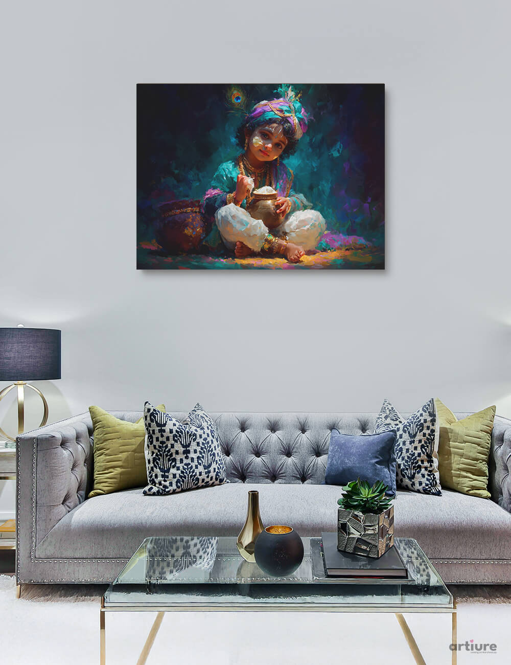 This artwork portrays the playful innocence of young Krishna, seated gracefully with a butter pot in his hands. Painted in rich, textured strokes of teal, purple, and golden hues, the scene glows with warmth and devotion. The peacock feather on his crown, the sparkle in his eyes, and the soft light cascading over his form evoke the divine mischief for which he is loved. Ideal for adding a touch of cultural charm and spiritual joy to any space.