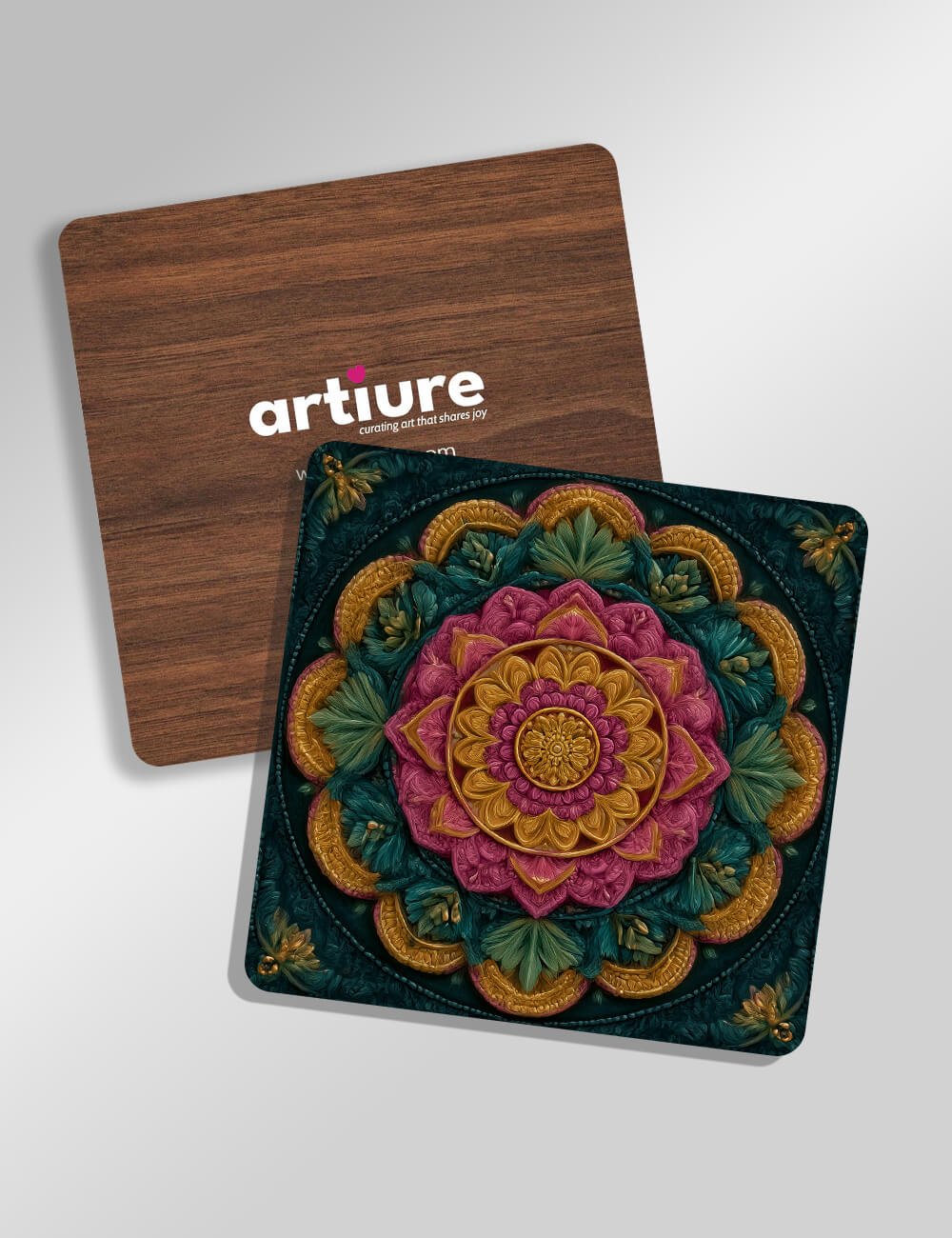 This coaster presents a vibrant mandala pattern with layered textures and a tactile feel. The central gold core radiates outward in pinks, teals, and emerald greens, accented by warm amber tones. The design fuses traditional ornamental motifs with a contemporary palette, making it suitable for modern dining rooms, coffee corners, and kitchen counters. Printed on a durable coaster surface, it blends artful detail with everyday practicality. Ideal for gifting or elevating casual meals, it invites mindful moments around the table. Its luxe color scheme pairs beautifully with beige, navy, and wood tones, adding ceremonial charm to dining spaces.