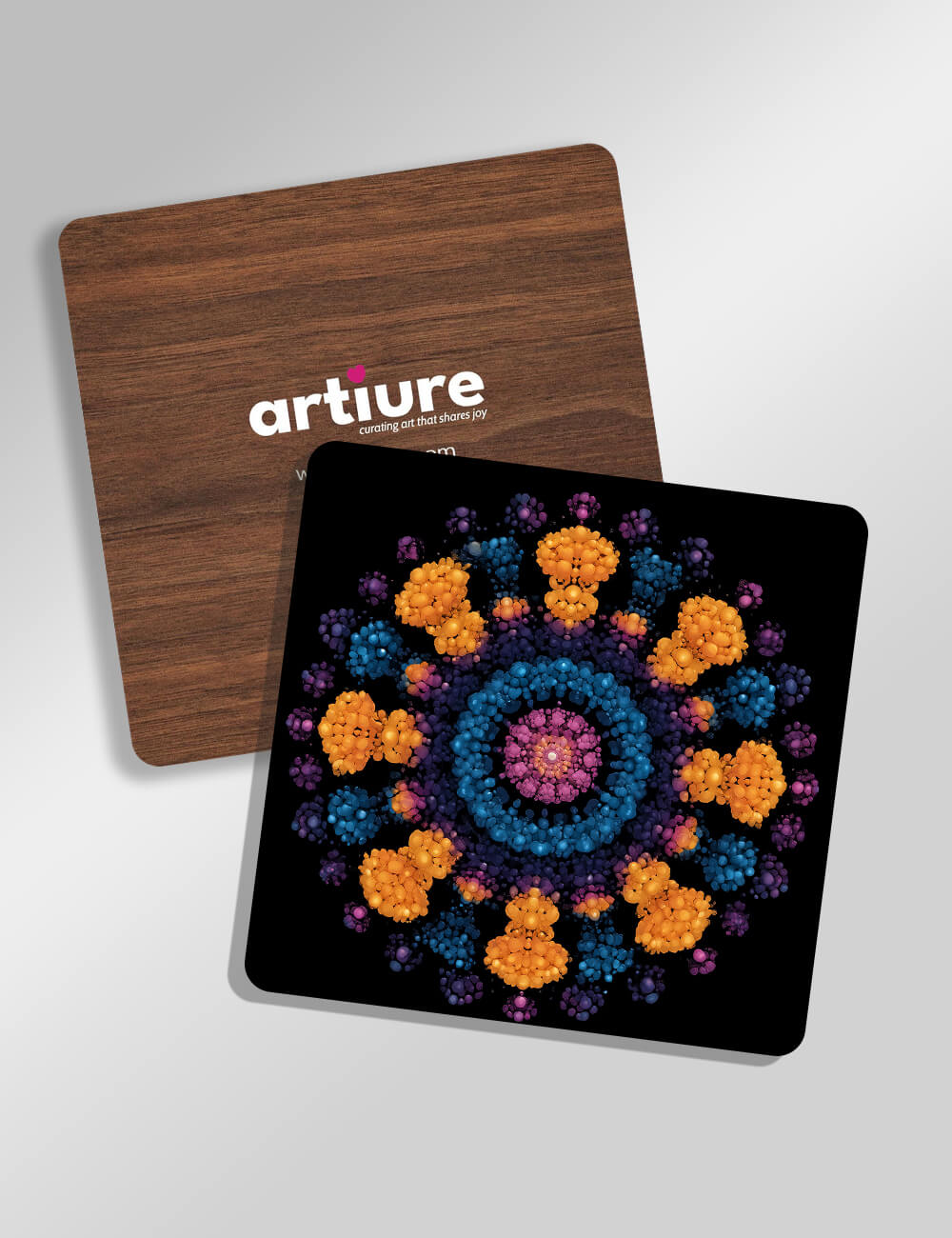 A set of coasters featuring a radiant mandala formed from clustered spheres in cobalt blues, electric oranges, purples and magentas on a deep black field. The design radiates from a vibrant center, with circular motifs repeating in precise geometry to create a sense of meditative balance. The high-contrast palette gives a bold, contemporary look perfect for modern kitchens and dining spaces. The piece blends abstract geometry with a touch of gem-like luminosity, offering a visually striking accent on wood or stone tabletops. When used as a functional art piece, these coasters celebrate color, craft, and joyful energy in everyday gatherings.