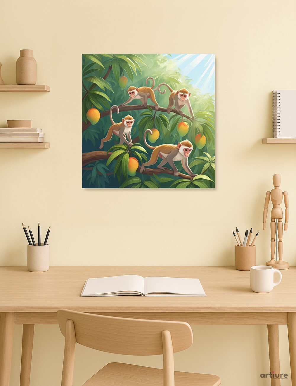 Whimsy meets tropical abundance in this canvas print, where four playful monkeys navigate a sun-dappled canopy. Lush leaves curl around vibrant mango tones while light threads through the foliage, giving the scene a sense of movement and joy. Rendered as a bold illustration, with clean shapes and rich gradients, the piece feels modern yet warm. The mood is buoyant and uplifting, perfect for nurseries, kids rooms, or cheerful living spaces. Pair it with warm woods and soft neutrals to create a tropical vignette that invites curiosity. Printed on canvas to enhance texture and depth, this artwork brings a playful escape into any wall it graces.