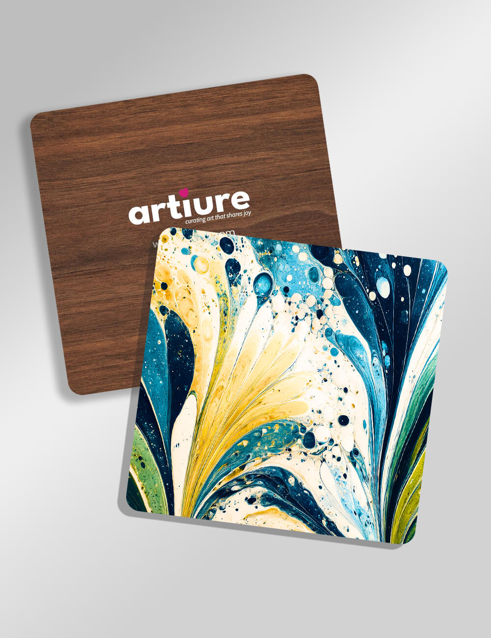 Two square coasters showcase a swirling marble motif in cobalt blues, teals, and sunlit gold, set against white accents. The high-contrast marbling creates a dynamic, waterlike pattern that brings modern artistry to kitchen and dining spaces. The surface is smooth and lacquered for easy cleaning, while a warm wood backing provides stability and a tactile contrast. Perfect for contemporary table settings, gifting, or everyday use, these coasters pair protection with a statement of color and movement.