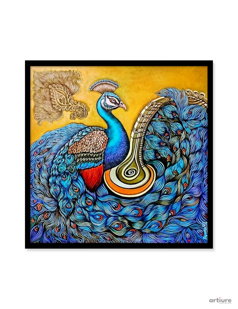 “Melody of Feathers” captures the majestic beauty of a peacock through intricate patterns and vibrant acrylic textures on canvas. The composition flows like music, with each feather echoing rhythm and harmony through swirling lines and detailed ornamentation. Rich hues of blue, teal, and gold contrast beautifully against the warm background, symbolizing grace, pride, and artistic expression. The stylized detailing gives the artwork a contemporary yet cultural essence, making it both decorative and meaningful. This piece evokes a sense of movement and serenity, transforming the peacock into a visual symphony that celebrates nature, elegance, and creative craftsmanship.