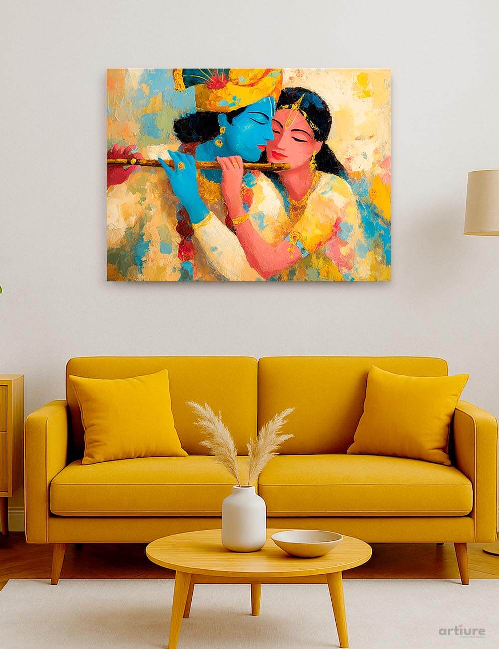 A stunning textured canvas artwork capturing the divine love of Krishna and Radha. With vivid brushstrokes and a pastel-bright palette, this piece evokes warmth, intimacy, and spiritual grace. Krishna’s blue form gently plays the flute as Radha leans in, lost in the music and the moment.