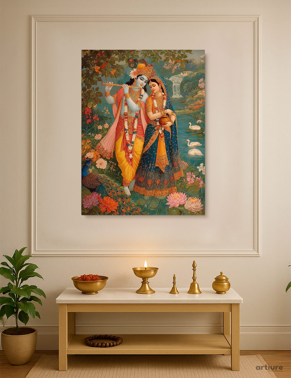 "Melody of Vrindavan" Canvas Print is a romantic and spiritual celebration of the eternal bond between Lord Krishna and Radha. Set amidst blooming lotuses, serene swans, and peacocks, Krishna plays his flute while Radha stands lovingly beside him, holding a pot near the Yamuna River. Dressed in richly adorned traditional attire, their expressions evoke grace, devotion, and harmony. This timeless artwork brings warmth and serenity to any sacred or living space.