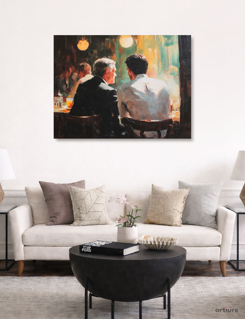 Two men sit with their backs to us, caught in a moment of quiet conversation at a softly lit city bar. The scene unfolds in broad, suggestive strokes that blur edges and dissolve details into an atmosphere of amber glow and tactile texture. Against a backdrop of warm highlights and cool shadows, the figures become a study in presence and restraint, their silhouettes anchored by a chair back and a glint of glass. The painting embraces impressionistic bravura—the pressed brushwork, the intermingling of color fields, the way light pools on faces and fabrics. Reproduced on canvas, it brings a cinematic stillness to a living space, inviting viewers to linger, interpret, and recall evenings when strangers felt almost familiar.