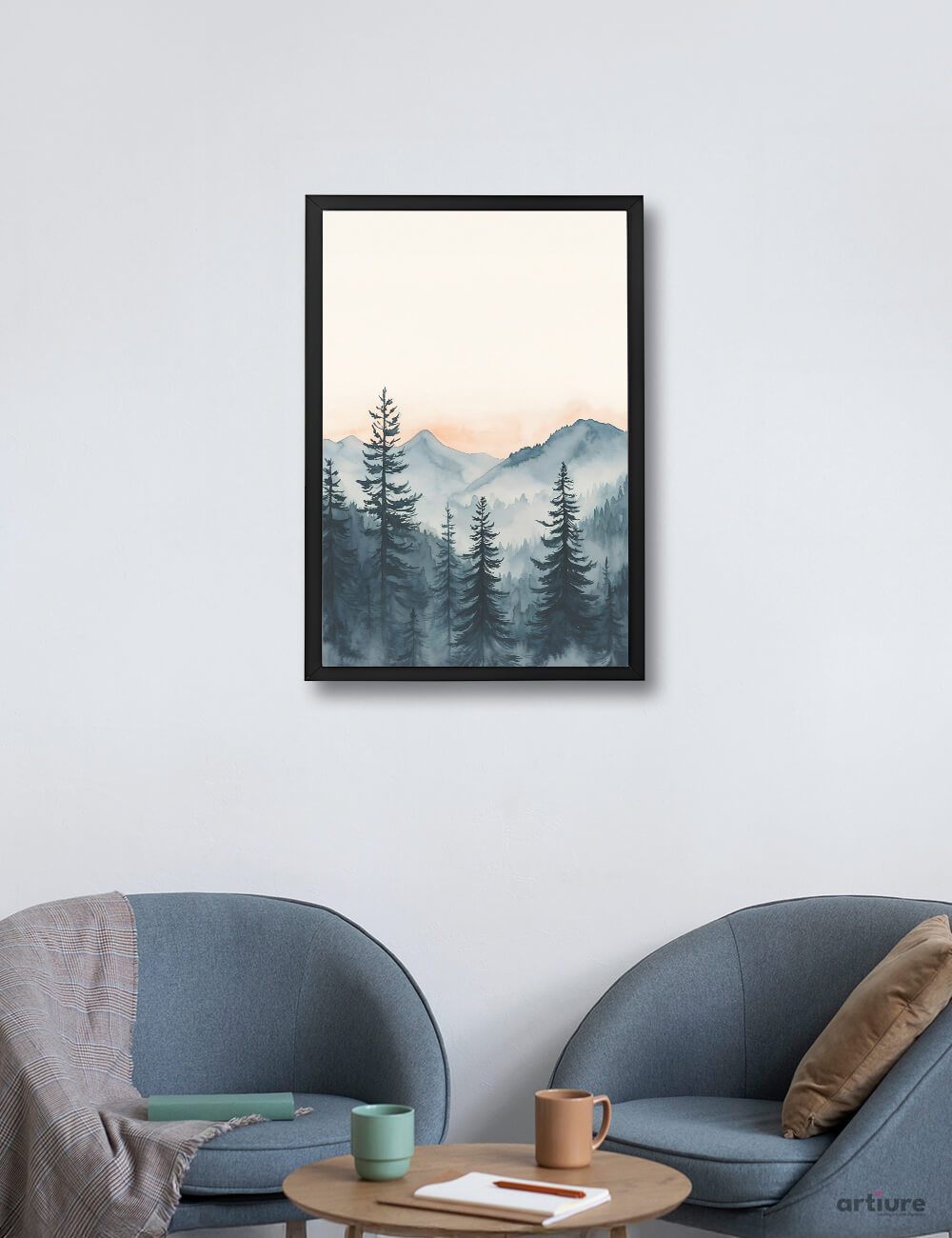 Mist Over Pines captures the serenity of a fog-kissed forest at dawn. This minimalist watercolor landscape features layered silhouettes of evergreen trees and distant mountains under a pale sky with soft hints of sunrise. Printed on FSC Certified, age-resistant paper, it brings calm and natural beauty to any space.
