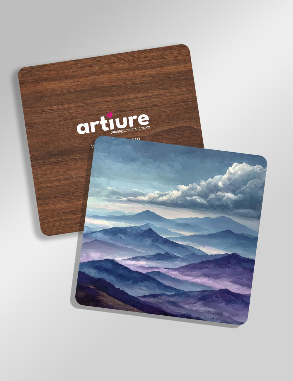 These coasters showcase a tranquil mountain landscape bathed in cool blues and purples, with soft cloud forms rolling over distant ridges. The printed front captures painterly, impressionistic brushwork, while the reverse reveals a warm wood texture that anchors the scene to the table. The composition blends contemporary illustration with mood-driven color gradients, offering a serene, versatile surface for everyday dining and coffee moments. Use them to dress a dining nook, kitchen counter, or office desk with a touch of nature and calm. The pairing of cool terrain hues and natural timber makes this set a refined gift for nature lovers, home decorators, or anyone seeking a quiet, stylish tabletop accent.