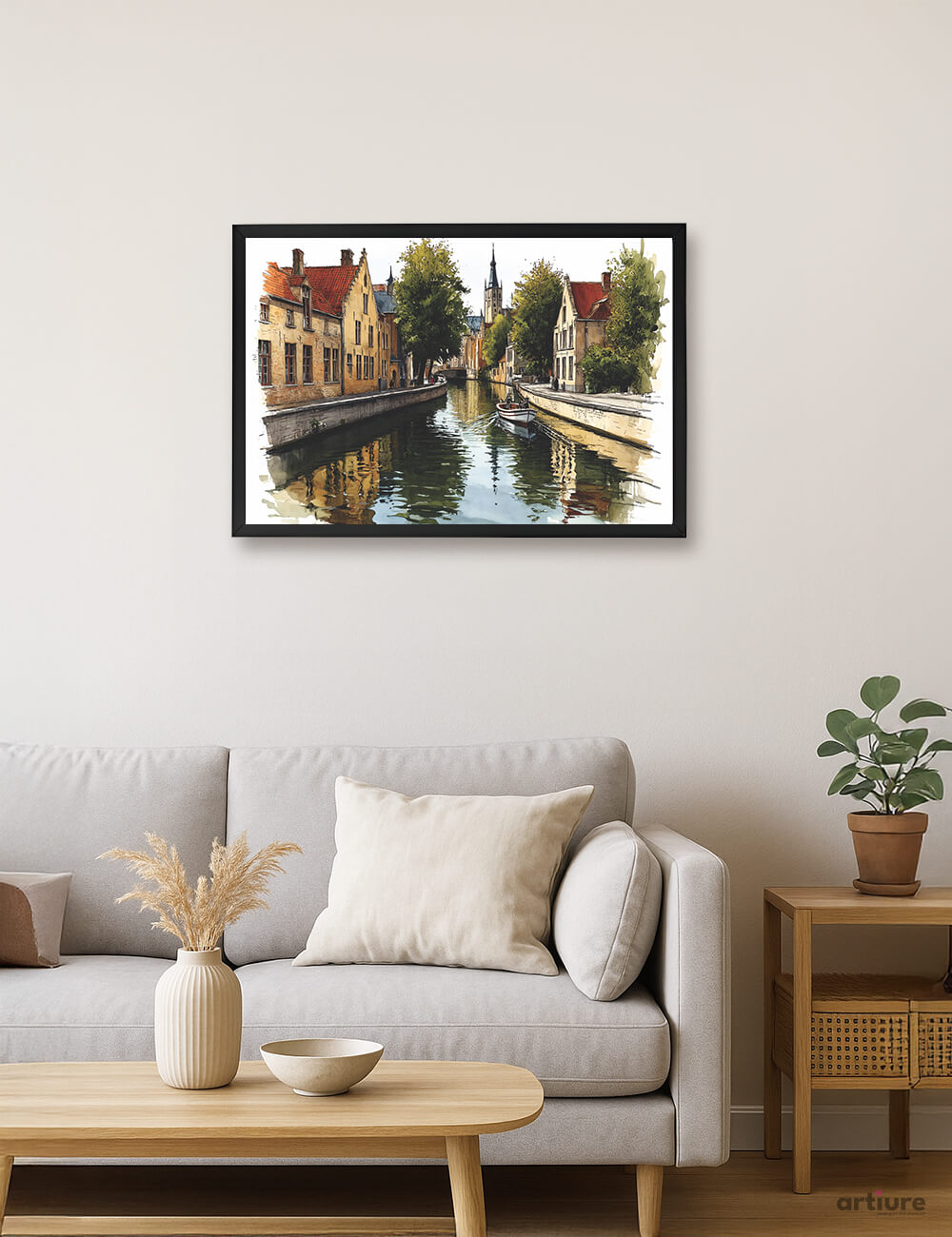 This calm and evocative piece captures the beauty of an early morning canal ride through a European town, likely Bruges. The reflections in the water mirror the elegance of gabled houses and the soft glow of daylight. With warm architecture and tranquil movement, this artwork invites viewers into a moment of stillness and charm—perfect for cozy corners and contemplative spaces.