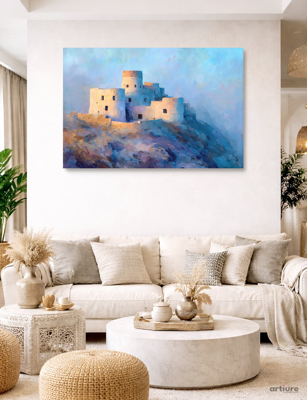 This artwork presents Dhayah Fort in a gentler mood, bathed in cool daylight rather than dramatic sunset tones. The fort’s pale surfaces reflect soft blues from the sky, creating a sense of calm and clarity. The textured terrain beneath appears less harsh, almost fluid, as brushstrokes blend rock and light into a unified surface. The structure does not dominate here. It settles into the landscape with quiet confidence. The composition emphasizes stillness, where the fort feels like a natural extension of the hill rather than an imposition upon it. The result is a contemplative portrait of presence, balance, and early-day silence in Ras Al Khaimah.