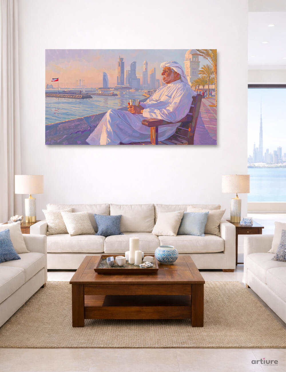 This artwork captures a reflective pause along the Abu Dhabi Corniche. A man dressed in traditional kandura and headscarf sits facing the water, holding a small glass of tea as the city skyline rises gently behind him. The sea is calm, mirroring the pale morning light, while boats and distant buildings suggest a city already in motion. Yet the subject remains still, grounded in the present. The composition balances heritage and modernity, where traditional presence meets contemporary architecture. The painting speaks to everyday dignity, routine, and the unspoken rhythm of life by the waterfront in Abu Dhabi.