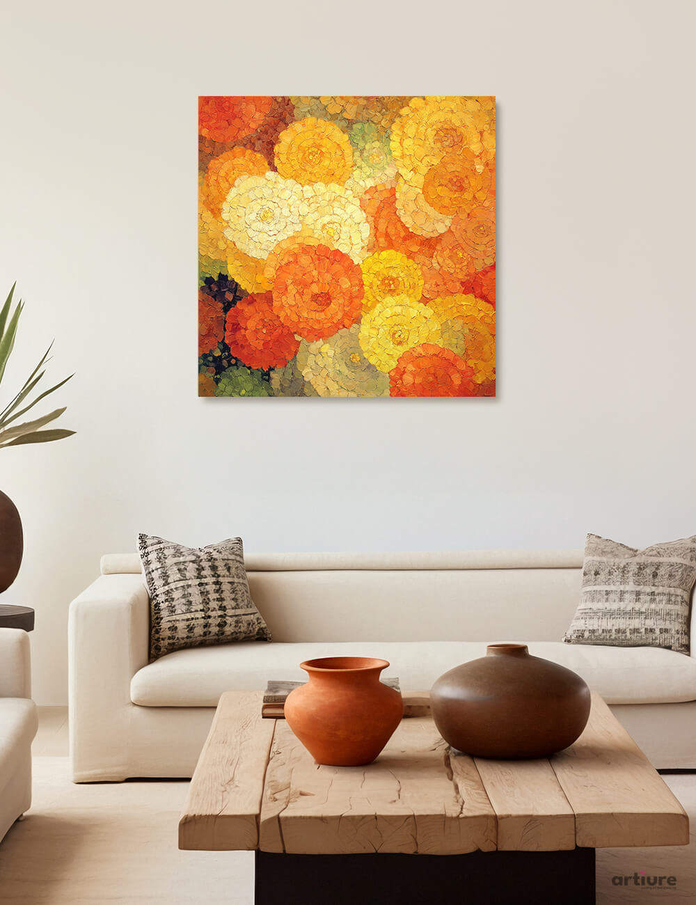 This canvas print presents a jubilant mosaic of circular blossoms in sunlit oranges, yellows, and creams. Each petal is built from tiny mosaic fragments, creating a textured surface that catches light and invites a closer look. The composition feels both contemporary and timeless, balancing bold color with soft, painterly edges. Set against a neutral wall, the piece warms living spaces and pairs beautifully with beige, taupe, or earthy tones. Ideal for brightening a seating area, it acts as a focal point that sparks conversation while maintaining a calm, inviting atmosphere. Perfect for modern living rooms, cozy corners, or a gallery-like wall in an open-plan home.