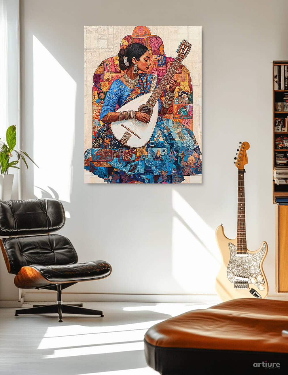 This canvas print presents a luminous fusion of portraiture and pattern. A poised woman in a cobalt blue dress cradles a guitar, surrounded by a patchwork of colorful tiles that form a vivid mosaic. The piece blends folk-art warmth with contemporary geometry, producing a dynamic focal point for living rooms or studios. Soft beige backgrounds anchor the composition while splashes of orange, red, and yellow draw the eye through the layers of tessellated fragments. The result is a celebration of music and craft, inviting quiet reflection or lively conversation. Printed on high-quality canvas, the artwork captures the texture and energy of the original mosaic while maintaining crisp detail and vibrant color.