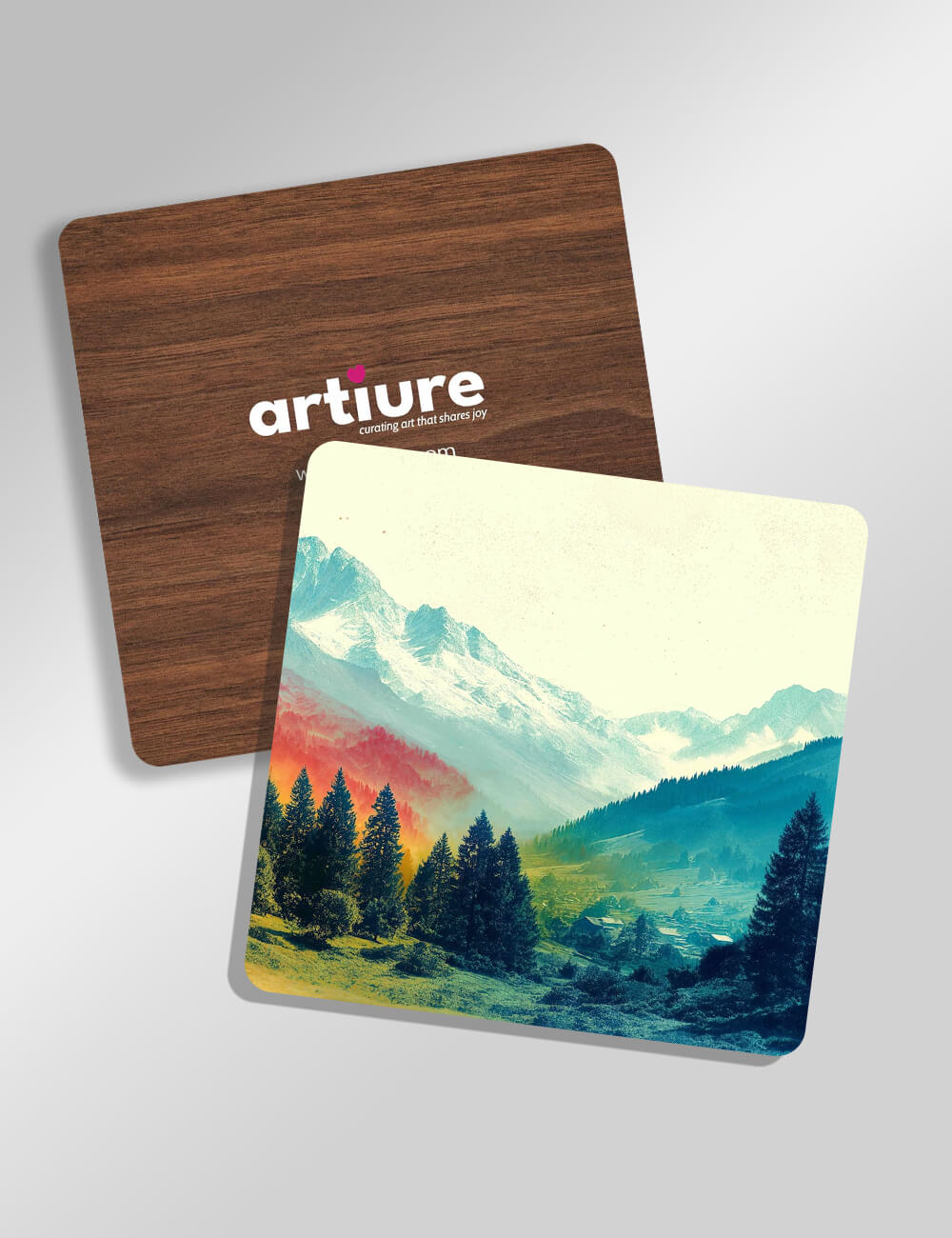 Two stylish coasters merge nature and craftsmanship for everyday elegance. The front coaster presents a vibrant mountain landscape—layered blues, teals, greens, and warm sunset tones—captured in a crisp, print-on-wood finish that stays striking after years of use. The back reveals a rich wood grain that adds tactile warmth and durability. Rounded corners, a smooth surface, and a snug fit prevent slips while highlighting a modern, nature-inspired aesthetic. Perfect for kitchen counters, dining setups, and coffee nooks, these coasters spark conversations and protect tabletops with playful sophistication. A thoughtful gift for nature lovers, design enthusiasts, and those who appreciate color-infused, contemporary accents in small spaces.
