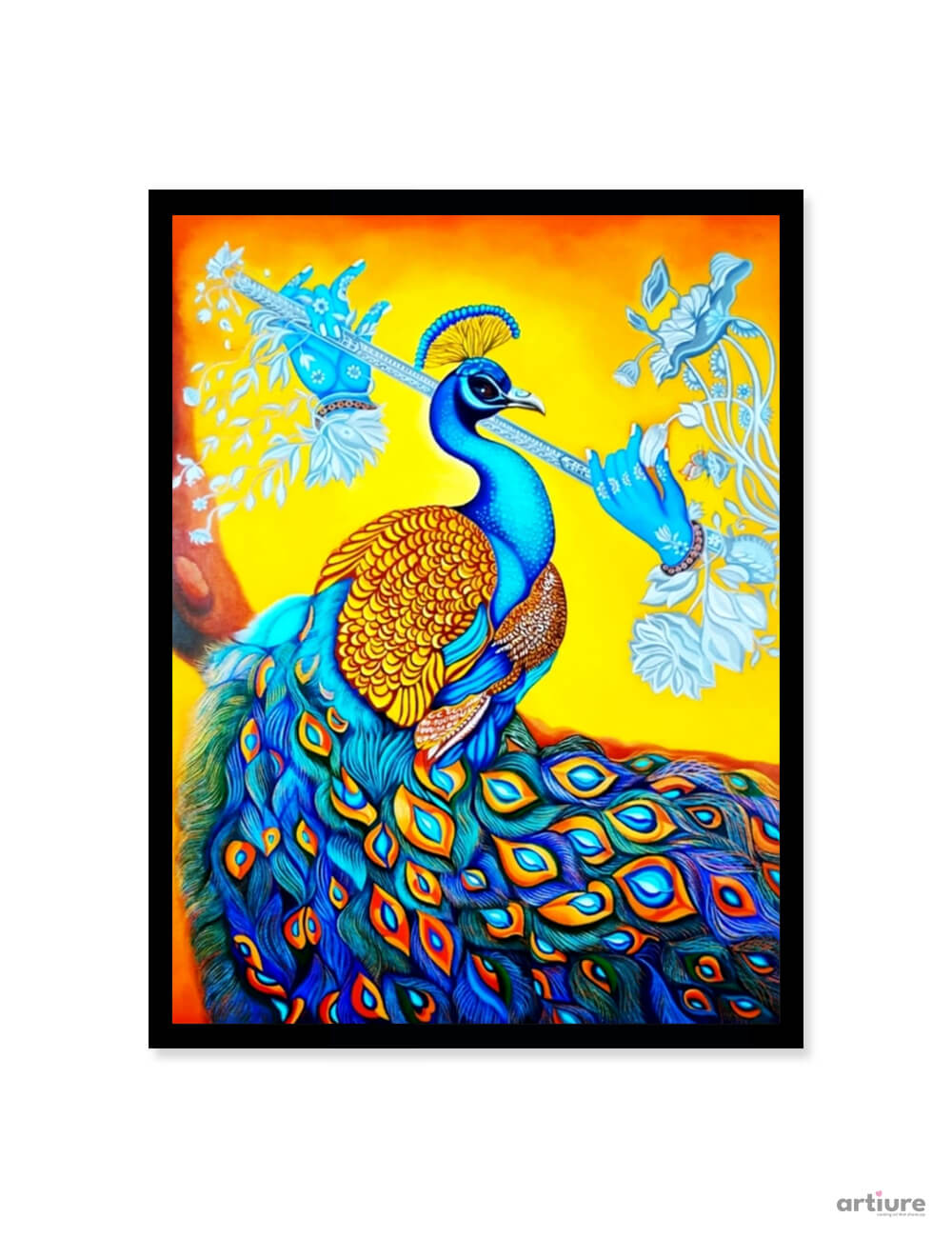 “Muralidhar” is a striking acrylic on canvas artwork that captures the majestic elegance of a peacock in a divine and symbolic form. The composition blends vibrant yellows, blues, and oranges, creating a radiant backdrop that enhances the intricate detailing of the peacock’s feathers. Inspired by Indian cultural and spiritual aesthetics, the artwork evokes a sense of divine beauty, grace, and harmony. The flowing patterns and ornamental elements add a contemporary decorative appeal while maintaining traditional symbolism. This piece stands as a celebration of nature, spirituality, and artistic expression, making it a captivating focal point for modern and classic interiors alike.