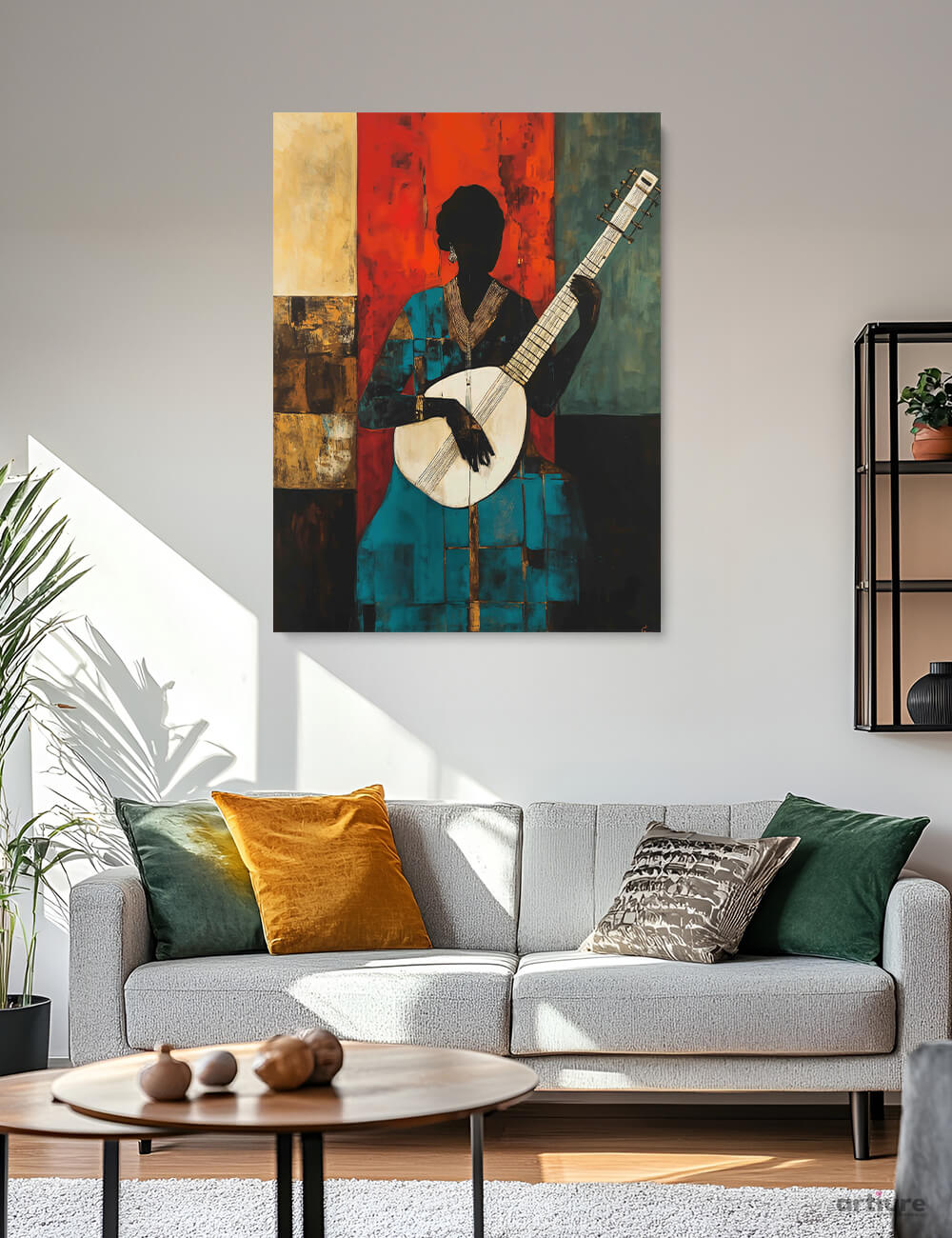 Mystic Lute Rhapsody captures an intriguing figure rendered in abstract form. The subject, draped in a vibrant blue ensemble contrasted by earthy brown and orange accents, plays a lute-like instrument with serene focus. Bold geometric patterns define the figure's silhouette, while the background melds warm red and brown tones with a stark cream section to create a richly textured, dynamic tapestry. Soft, diffused lighting enhances the intricate brushwork and abstract quality, evoking a mood of introspection, artistic elegance, and cultural depth. Ideal for living rooms, cultural centers, and art studios.