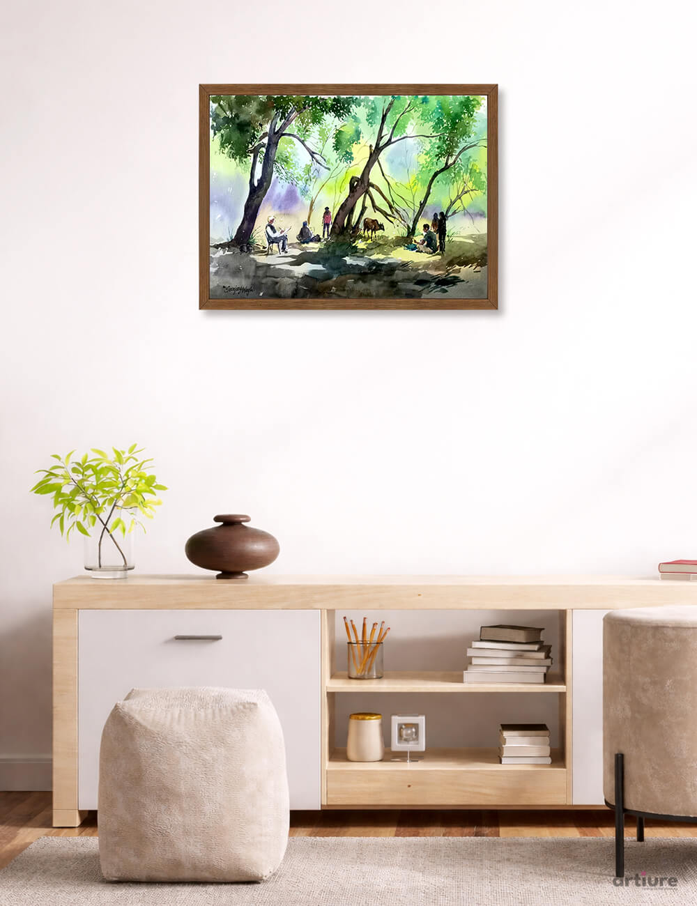 “Nature’s Classroom” beautifully captures a tranquil moment where individuals gather beneath sprawling trees, immersed in a shared experience of learning and reflection. The watercolor technique brings softness and fluidity, blending light and shadow to evoke a peaceful rural setting. Figures seated, standing, and interacting suggest a harmonious connection between humans and nature. The lush green canopy filters sunlight, creating an atmosphere of calm and contemplation. This artwork symbolizes the timeless idea that nature itself is a teacher, offering lessons in simplicity, community, and mindfulness. It invites viewers to pause, breathe, and rediscover the quiet wisdom found outdoors.
