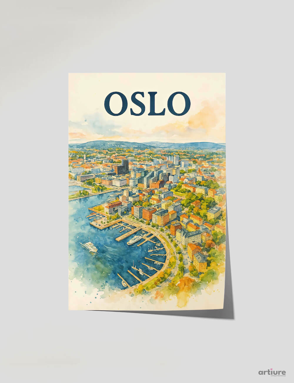 This beautifully illustrated poster presents Oslo’s modern elegance with a serene harbor view, clean-lined architecture, and lush surroundings. With boats dotting the waterfront and the Nordic cityscape rising behind, the artwork brings a perfect blend of tranquility and metropolitan charm—ideal for lovers of Scandinavian design and scenic cities.