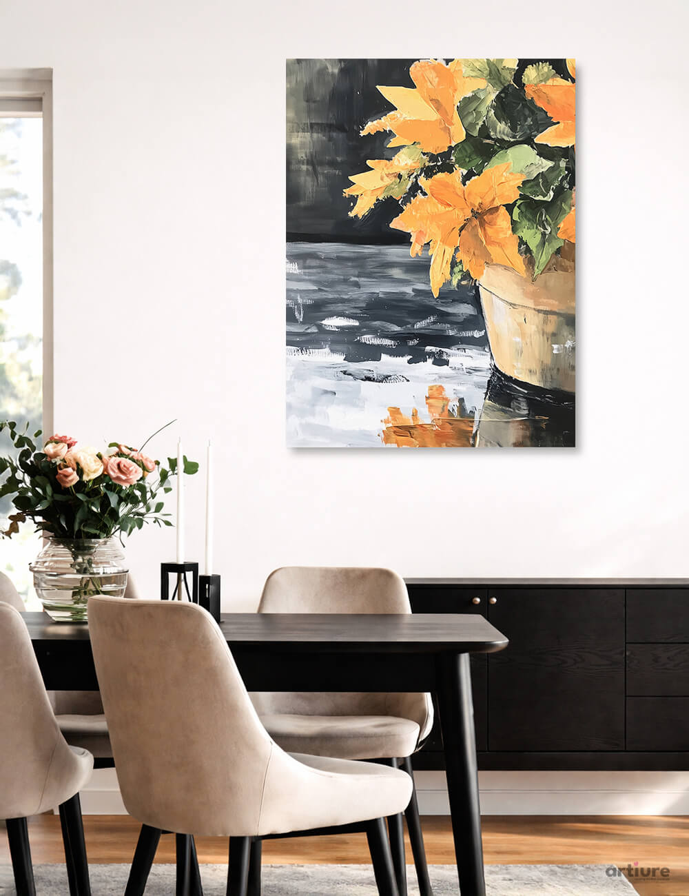 There's something about the way these orange blooms refuse to fade that stops you mid-thought. They burst from their earthen vessel with the defiance of late autumn — petals edged in gold, leaves still clinging to summer's green. The brushwork is thick, confident, each stroke holding the weight of seasons changing. Behind them, stormy grays suggest rain coming, but these flowers aren't backing down. The ceramic pot sits solid and sure, its warm browns anchoring all that wild color above. This is the kind of piece that brings warmth to any room that needs it — a dining room where stories are shared, a kitchen corner that catches morning light, or a living room wall ready for something bold and beautiful.
