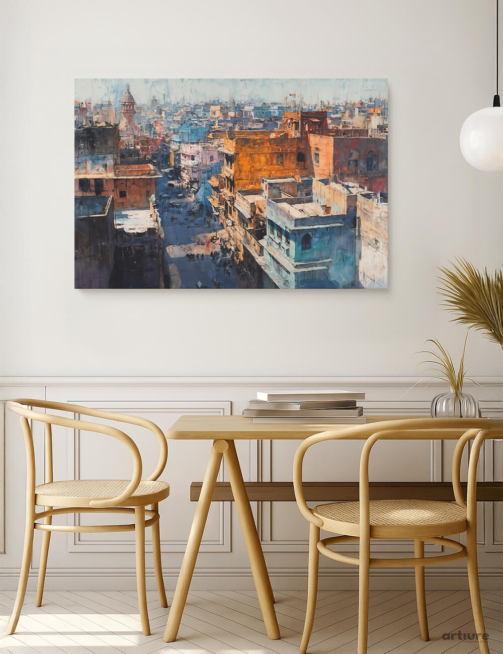 An energetic cityscape rendered in painterly strokes, this canvas print captures sunlit facades and narrow streets in a chorus of oranges, browns, blues, and teals. The layered textures suggest distance and movement, inviting the eye to travel from shadowed alleys to sunlit rooftops. On a light wall, the piece acts as a focal point that pairs contemporary furniture with classic detailing, echoing the dining area’s warm wooden tones and airy atmosphere. The work blends impressionist tenderness with abstract geometry, creating a vibrant urban mood that feels both timeless and modern. Ideal for brightening living rooms, dining nooks, and creative workspaces, it brings energy without overpowering the space.