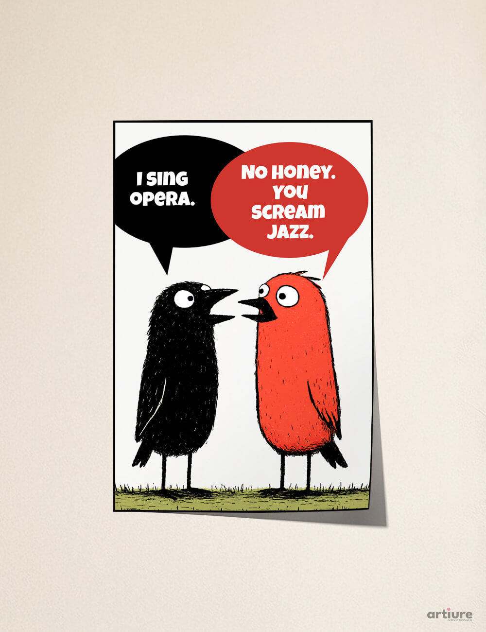 This quirky comic-style illustration captures two birds mid-feathered feud over vocal superiority. One thinks it’s opera, the other knows it’s chaotic jazz. A perfect wall piece for creatives, musicians, or anyone who’s ever lost a playlist battle.