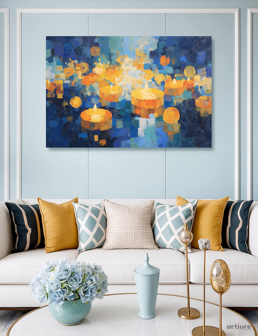 A luminous abstract canvas print that captures floating orbs of warm amber and gold amid a deep blue and teal backdrop. The brushwork suggests impressionistic light play, with luminous patches forming circular orbs that glow against a moody, cool-toned sea of color. This piece brings a dynamic, contemporary energy to living spaces, offering visual warmth and movement that complements both neutral and bold furnishings. Ideal for modern lounges and statement walls, it pairs well with blues, yellows, and metallic accents to create a sophisticated, sunlit atmosphere.