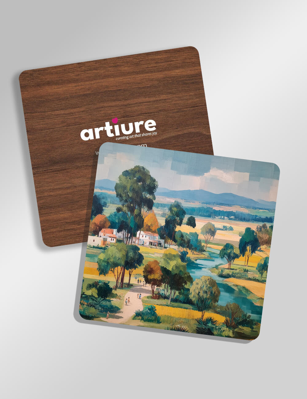 An exuberant landscape unfolds in bold, painterly blocks of emerald greens, azure blues, and warm ambers, captured in an impressionistic vista across rolling fields and winding rivers. The scene evokes a sunlit countryside with trees, cottages, and distant hills, rendered with broad brushwork and vibrant contrasts that celebrate nature’s rhythm. Transferred to a rustic coaster, the artwork pairs the tactile warmth of wood with a dynamic palette, inviting relaxed moments over coffee or tea. This piece brings a handcrafted gallery vibe to dining spaces, offering a calm that sparks conversation and memory.