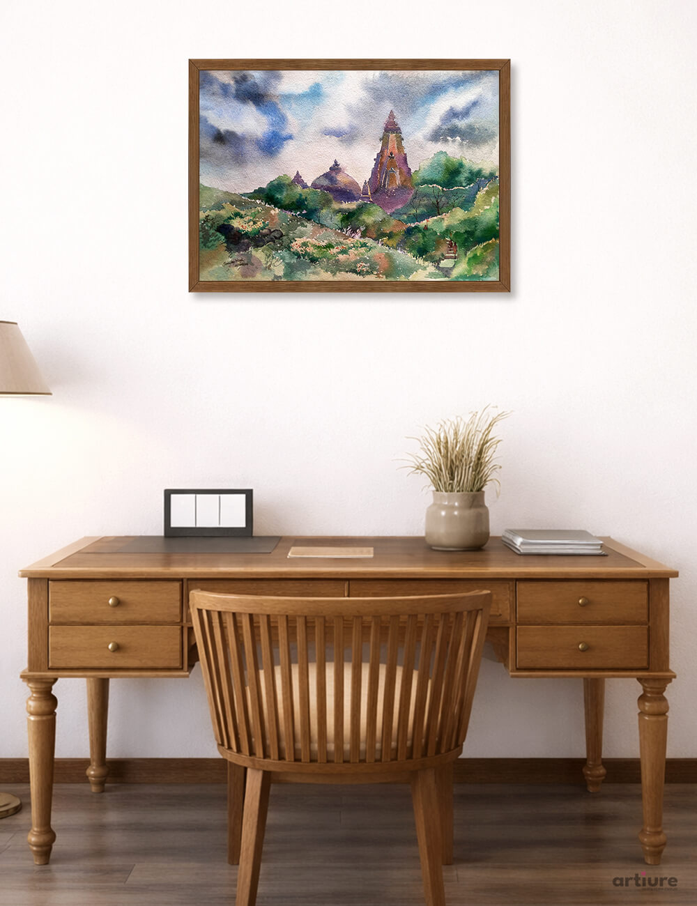 Path to the Sacred beautifully illustrates a tranquil journey toward spirituality, where nature and devotion harmoniously coexist. The watercolor composition showcases a majestic temple rising amidst lush green landscapes, gently leading the viewer’s eye along a serene pathway. Soft washes of blues and earthy tones create a calming sky, enhancing the peaceful ambiance of the scene. The surrounding foliage, rendered with delicate brushstrokes, adds depth and life to the composition. This artwork evokes a sense of inner peace, reflection, and connection with the divine, making it a perfect piece for spaces seeking calmness, inspiration, and a touch of cultural spirituality.