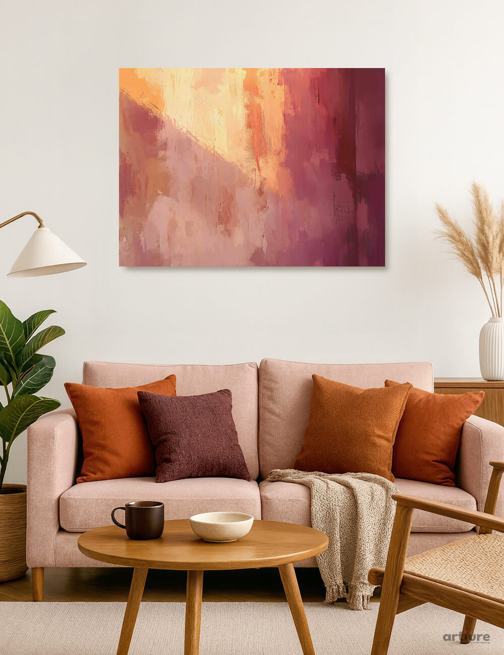 Peachy Diagonal Drift is an expressive abstract painting featuring a warm color palette of peach, pink, and burgundy. The composition is richly textured with visible brushstrokes that create a soft yet dynamic movement across the canvas. Seamless light gradients and a subtle diagonal division add depth and interest, while the direct perspective highlights the interplay of colors and textures without a distinct focal point. This serene, introspective piece is perfect for modern living spaces and creative studios.
