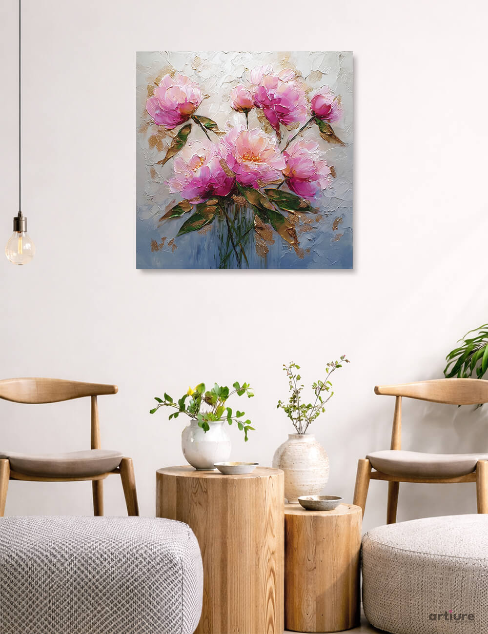 There's something about the way these peonies hold themselves — proud but tender, like secrets bloomed into light. Each petal unfurls with the confidence of morning, painted in shades that move from whisper-soft pink to bold magenta declarations. The artist's palette knife has worked magic here, building texture that makes you want to reach out and touch the velvet softness. Gold leaf catches the light like scattered stardust, while the blue-gray background melts away like a half-remembered dream. This is the kind of piece that transforms a room from ordinary to sanctuary — perfect for a bedroom wall where you wake to beauty, or a living room corner that deserves to bloom year-round.