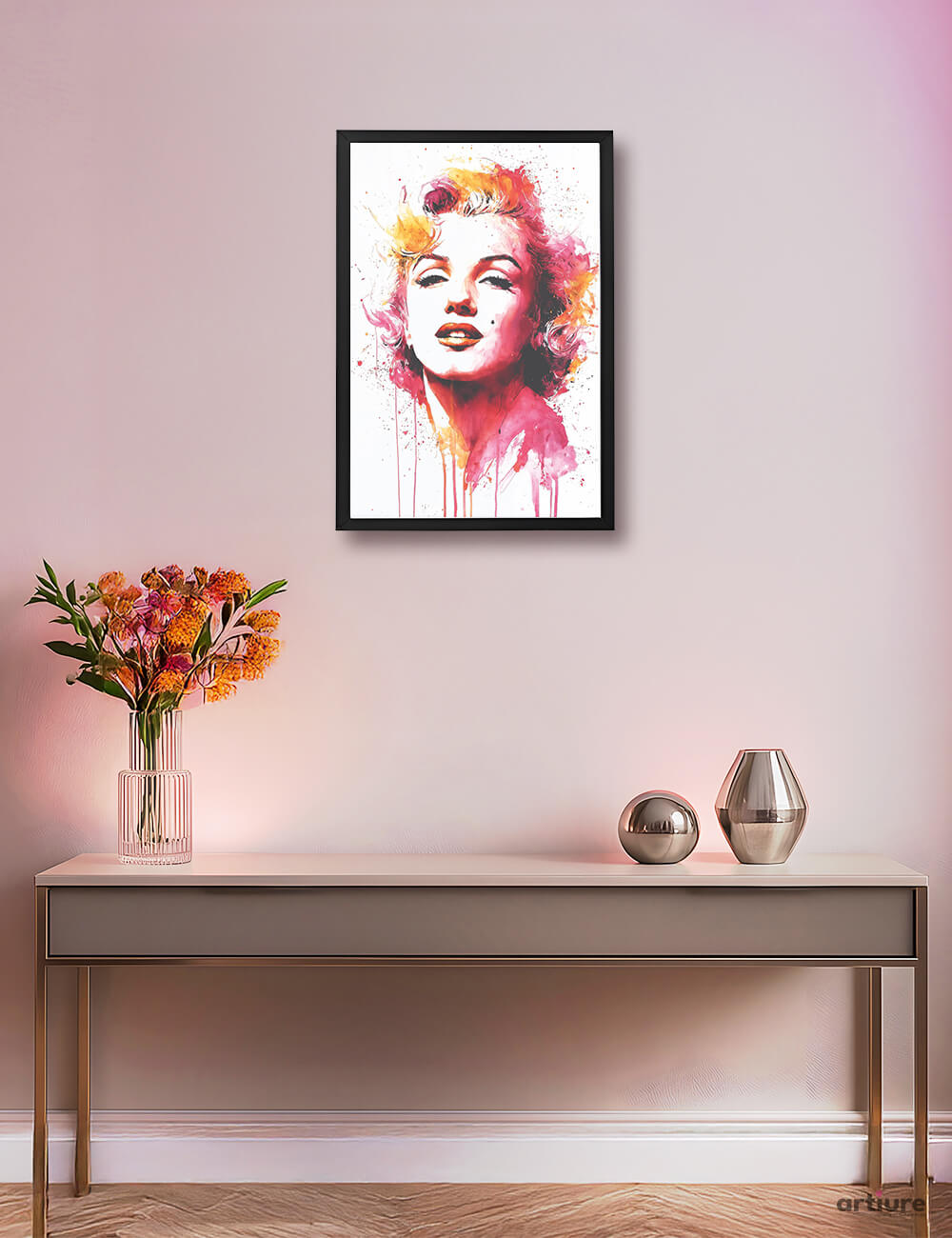 Pop Icon Flame captures the fiery charisma of Marilyn Monroe through a modern watercolor lens. With expressive brushwork and a high-contrast palette of pinks and oranges, this artwork radiates star power and feminine allure. It's an ideal statement piece for fans of classic cinema, retro style, or expressive pop-inspired interiors.