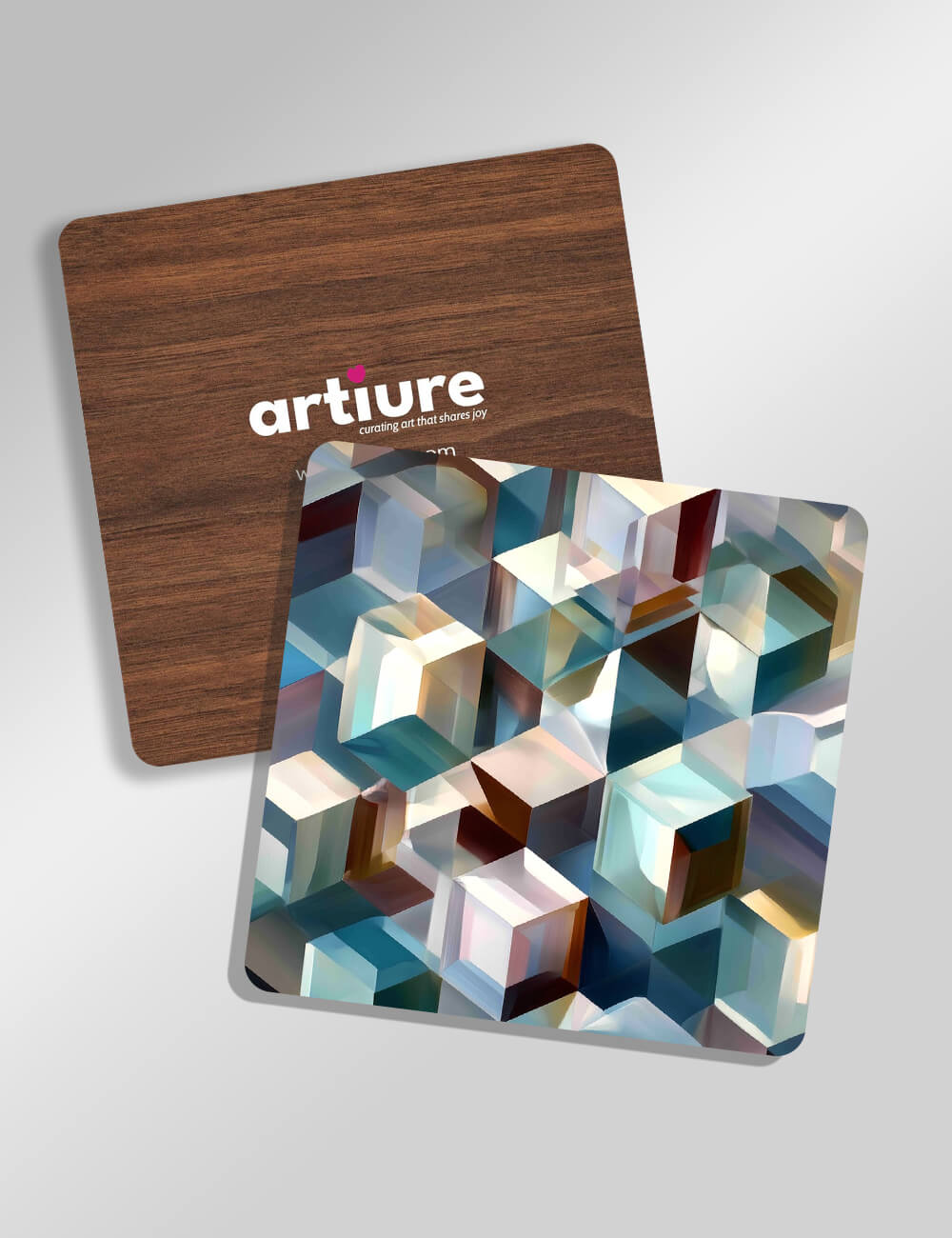 These coasters fuse modern geometry with warm, natural contrast. Each piece features a mosaic of prism-like cubes in blues, teals, greens, purples and earth browns, catching light from every angle and refracting it into soft, jewel-toned glints. The multi-faceted design sits on a durable wood backing, balancing tactile coziness with architectural clarity. Ideal for contemporary dining rooms and creative workspaces, they protect surfaces while adding a sculptural accent to tabletops, coffee bars, or kitchen islands. The compact form invites casual use as well as thoughtful gifting for design lovers who appreciate color, texture, and a touch of whimsy. Bring a kinetic, ever-shifting mood to everyday moments.
