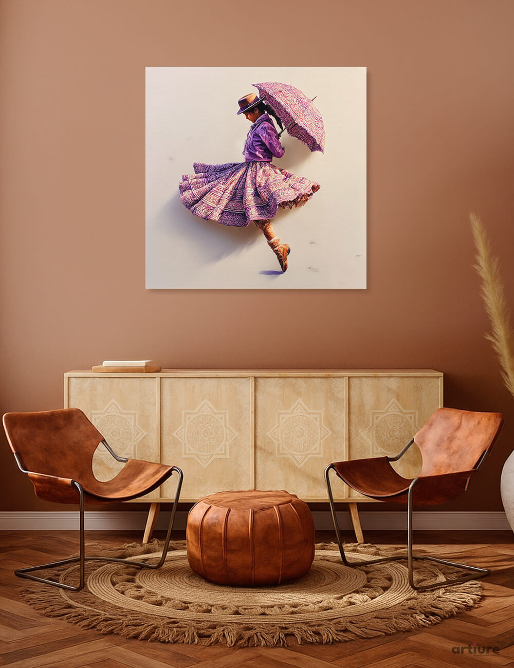 An exuberant canvas print that freezes a dancer in midair, her purple gown fluttering and umbrella tilted above her as she spins. The composition pulses with motion and grace, blending retro fashion with a contemporary edge. Dominant browns and cream walls frame the vivid lilac-pink ensemble, making the figure pop against a warm, subdued background. This artwork brings a sense of kinetic joy to living rooms, studios, or hallway galleries, pairing classic silhouettes with a modern print finish. The piece feels airy and elegant, inviting playful energy into calm interiors while nodding to timeless elegance.
