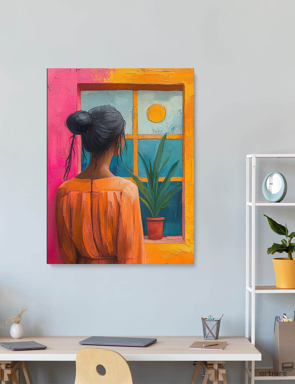 Quiet Window Reflection features a woman seen from behind, standing by a brightly colored wall and looking out at a serene sky. The potted plant on the windowsill adds a hint of nature, symbolizing hope and growth. Painted in warm, textured brushstrokes, this piece evokes calm, introspection, and the promise of a new day.