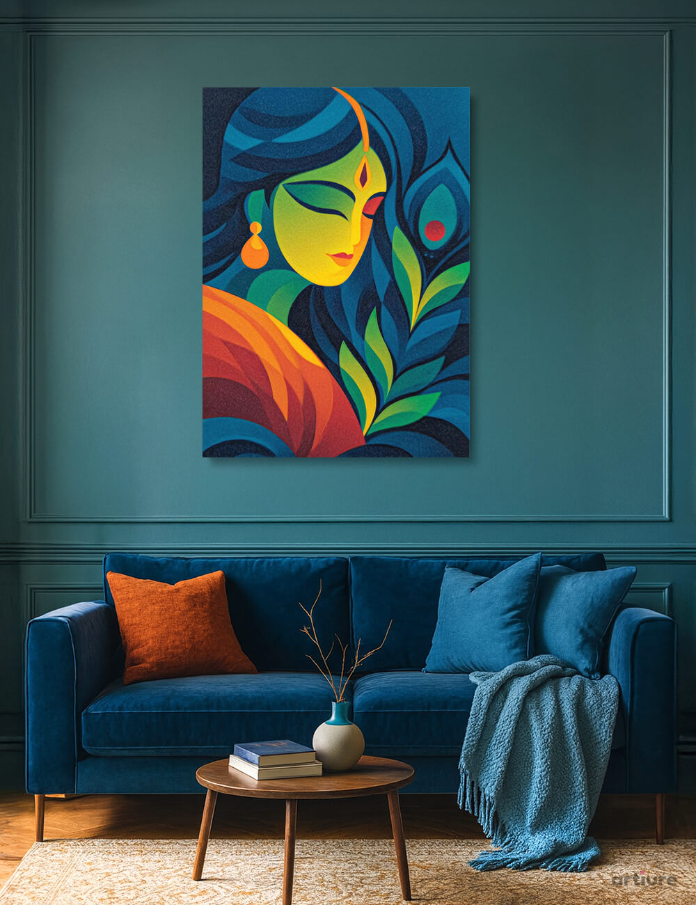 "Radha in Colours" Canvas Print blends bold shapes and vivid gradients to portray Radha’s serene beauty. The composition features a stylized peacock feather, symbolizing her eternal connection with Krishna, alongside a warm, glowing face framed in jewel tones of blue, green, yellow, and orange. The modern abstract style adds a contemporary twist to traditional devotion, making it a striking piece for both cultural and modern interiors.