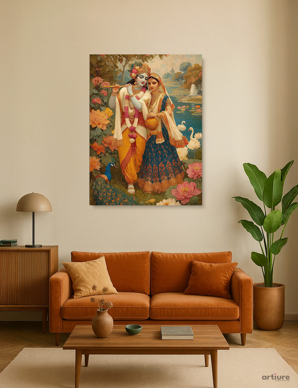 "Radha’s Grace, Krishna’s Tune" Canvas Print portrays an iconic scene of love and devotion. Krishna, adorned in golden robes and floral garlands, plays his flute as Radha walks beside him, holding a pot close to her heart. Surrounded by lotus blooms, a peacock, and gentle swans, the landscape echoes Vrindavan’s romantic mysticism. This artwork radiates serenity and spiritual beauty, perfect for pooja rooms, wedding gifting, or spaces meant for love and reflection.