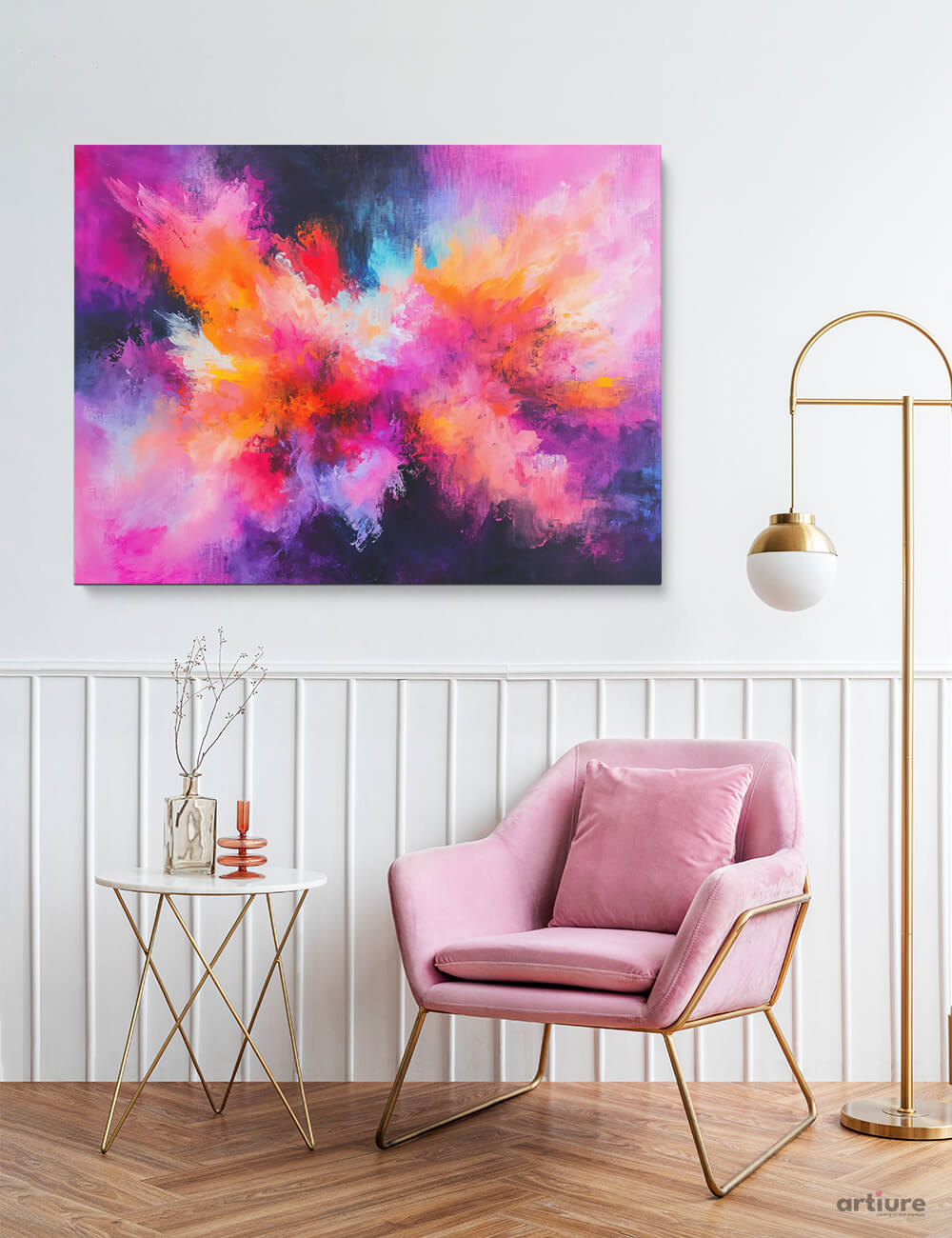 Radiant Colorburst depicts a swirling cloud of intense color, merging shades of magenta, tangerine, lavender, and sapphire in an abstract dance of pigment. Painted in a fluid, contemporary style, it exudes an energetic yet ethereal presence—ideal for modern living rooms, offices, or creative studios seeking a bold, expressive focal point.