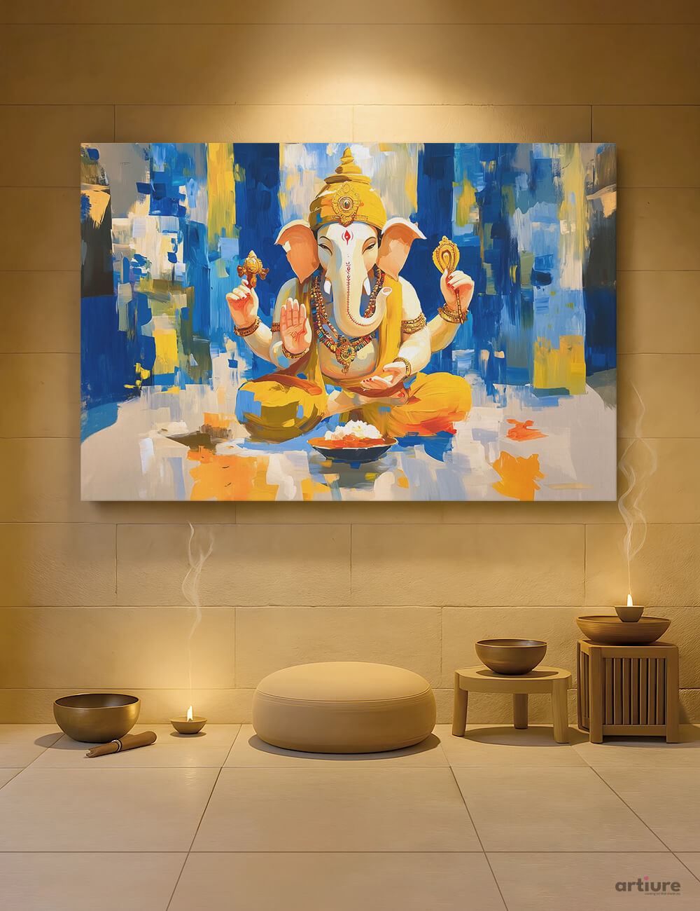 Radiant Ganesha presents the revered Elephant-headed deity in bright, expressive colors and dynamic brushstrokes. The modern, folk-inspired approach highlights Ganesha’s attributes of wisdom and prosperity, making it a captivating focal point for both spiritual and cultural settings.