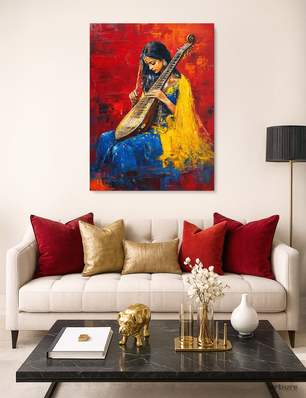 An exuberant canvas moment captures a woman gently caressing a veena, her gaze lowered as if absorbed in a distant raga. Thick impasto textures fuse crimson backgrounds with electric blues and sunlit yellows, creating a dynamic dialogue between heat and harmony. The musician’s flowing garments—blue sari and a bright yellow drape—unfold like rhythm across the composition, while the veena curves with melodic grace. This contemporary impressionist study blends cultural motifs with bold brushwork, turning music into color and motion. Ideal for living rooms and creative spaces, the canvas print injects warmth, energy and an Indian classical aura into any wall.