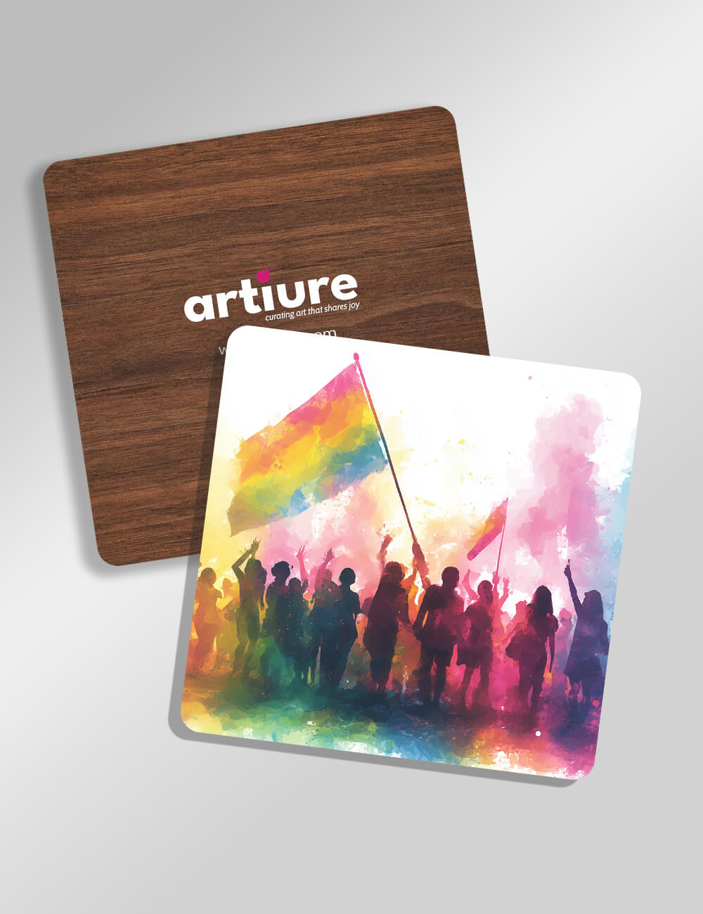 These coasters capture a festival of color and movement, rendered in a watercolor-inspired splash of pigment. Silhouettes of a cheering crowd rise against a vibrant rainbow wash, evoking energy, celebration, and togetherness. The design transitions from warm to cool tones, making a bold statement on any dining or coffee setup. Printed on durable coasters with a wood-look backing, each piece protects surfaces while adding artistic personality to kitchens, dining rooms, or entertaining spaces. Perfect for gifting to art lovers, hosts, or anyone who loves colorful decor, these coasters brighten daily rituals and special occasions alike.