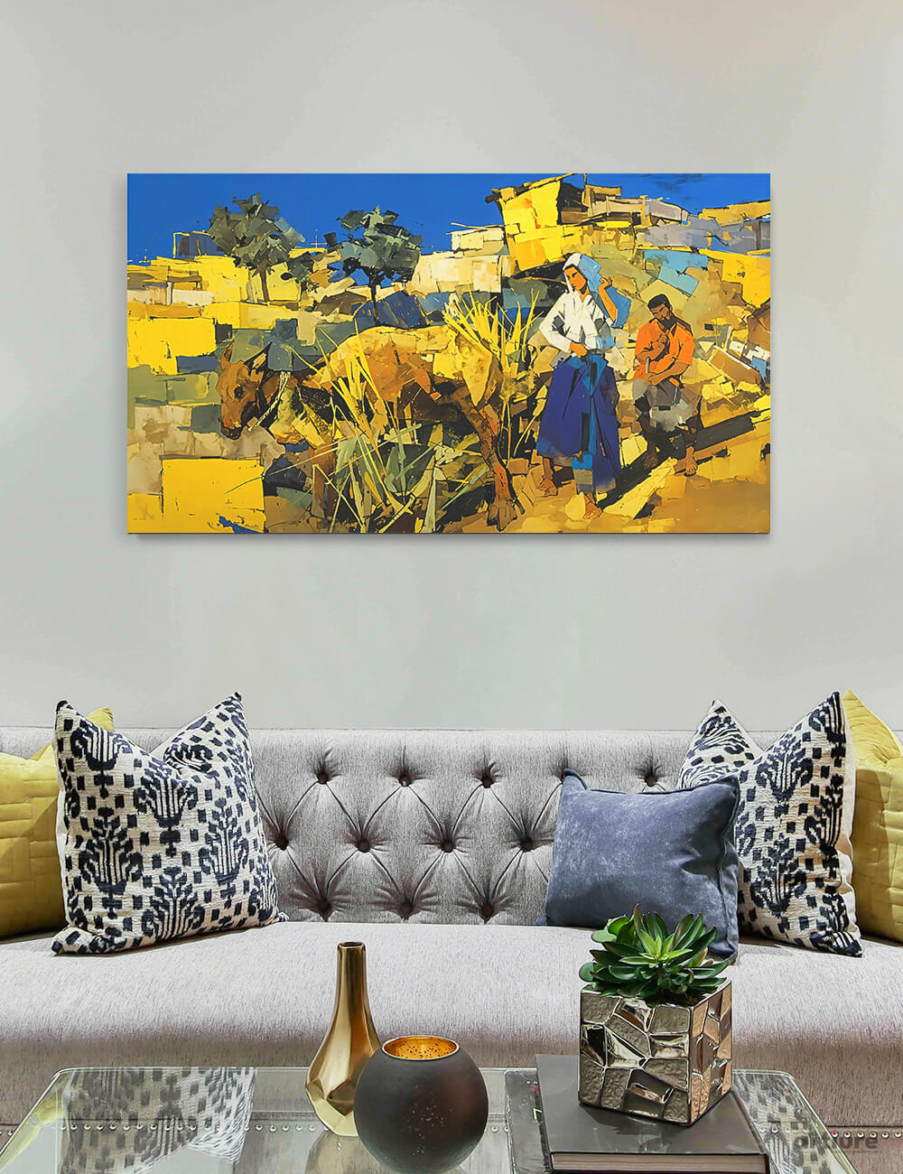 Rajasthani Pastoral Vignette captures the warm hues and textured geometry of a desert landscape. Painted in a blocky, impressionistic style, it depicts a woman tending a goat and a man resting nearby, evoking the spirited charm of rural Rajasthan. Perfect for cultural centers, living rooms, or offices seeking a lively, regionally inspired focal point.