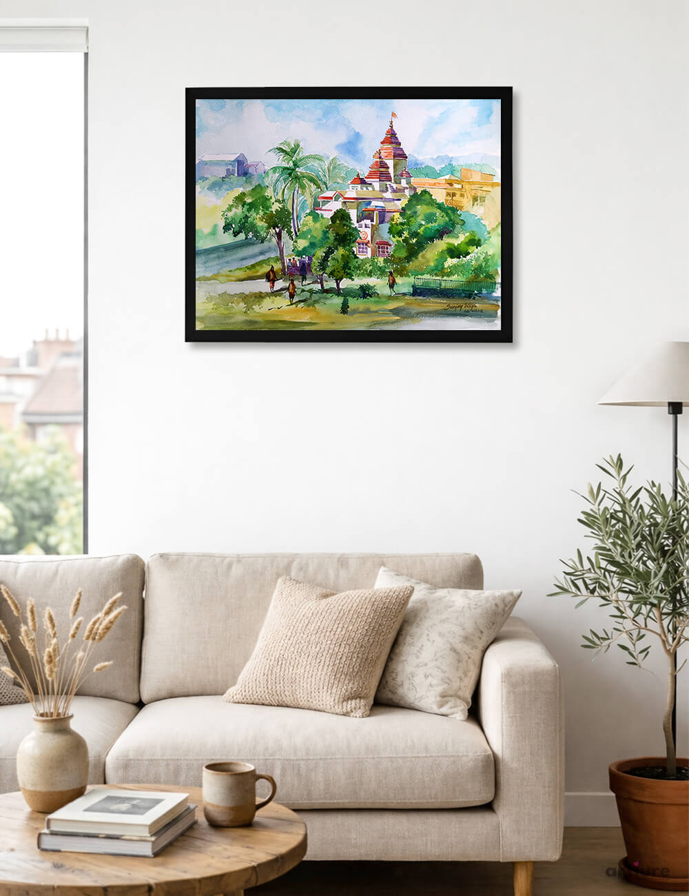 “Ramanjaneya – Temple of Strength & Faith” captures the serene beauty of a sacred temple nestled within lush greenery and rural surroundings. This watercolor painting reflects the harmonious coexistence of devotion and nature, where towering temple architecture rises gracefully amidst trees and open landscapes. The soft brushwork and delicate color palette evoke a peaceful atmosphere, highlighting everyday life with figures moving quietly along the path. The artwork conveys a sense of spiritual grounding, strength, and timeless faith, inviting viewers to pause and connect with the calm energy of this divine space. It beautifully celebrates tradition, culture, and inner tranquility.